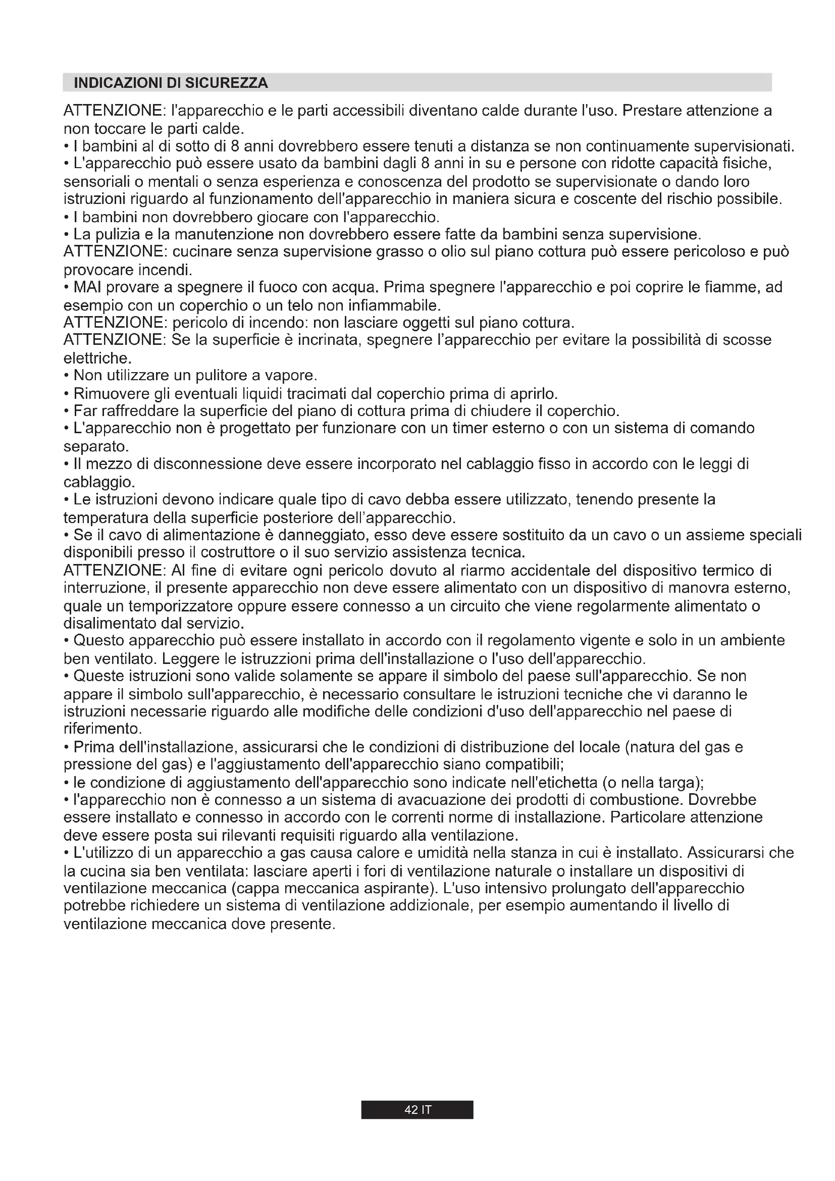 Questo apparecchio può essere installato in accordo con il regolamento vigente e solo in un ambiente ben ventilato. Leggere le istruzzioni prima dell'installazione o l'uso dell'apparecchio. Un piano gas produce umidità e calore nell'area in cui è installato. Per questa ragione bisogna garantire una buona ventilazione sia tramite passaggio di aria naturale sia grazie all'installazione di una cappa d'aspirazione. Un uso intensivo e prolungato dell'apparecchio richiede una ventilazione maggiore, come l'apertura di una finestra o aumentando la velocità di ventole di raffreddamento, se possibile. Se non vi è la possibilità di installare una cappa, un aspiratore può essere installato su una parete esterna o su una finestra affinché ci siano delle correnti d'aria nell'area. Una ventola elettrica è in grado di assicurare un cambio d'aria completo nella cucina 3-5 volte ogni ora. L'installatore dovrà seguire gli standard nazionali pertinenti. 43 IT