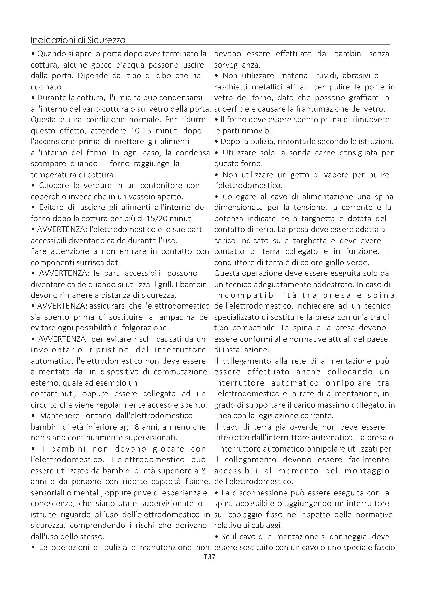 Sommario IT 39Vi ringraziamo per aver scelto uno dei nostri prodotti. Per utilizzare il forno in modo ottimale è consigliabile leggere con attenzione questo manuale e conservarlo con cura per ogni ulteriore consultazione. Prima di installare il forno, prendere nota del numero di serie in modo da poterlo comunicare al personale del servizio di assistenza in caso di richiesta di intervento. Dopo aver rimosso il forno dall’imballaggio, verificare che non abbia subito danni durante il trasporto. In caso di dubbi, non utilizzare il forno e richiedere l’assistenza di un tecnico qualificato. Tenere tutto il materiale da imballaggio (sacchetti di plastica, polistirolo, chiodi) fuori dalla portata dei bambini. Alla prima accensione del forno può svilupparsi fumo di odore acre, causato dal primo riscaldamento del collante dei pannelli d’isolamento avvolgenti il forno: si tratta di un fenomeno assolutamente normale e, in caso si verificasse, occorre attendere la cessazione del fumo prima di introdurre le vivande. Il produttore declina ogni responsabilità in caso di mancata osservanza delle istruzioni contenute in questo documento. NOTA: le funzioni, le proprietà e gli accessori dei forni citati in questo manuale possono variare a seconda dei modelli. Utilizzare il forno solo per lo scopo per cui è stato progettato, ossia solo per la cottura di alimenti; qualsiasi altro utilizzo, ad esempio come fonte di riscaldamento, è considerato improprio e quindi pericoloso. Il costruttore non può essere considerato responsabile per eventuali danni derivanti da usi impropri, erronei ed irragionevoli. L’uso di un qualsiasi apparecchio elettrico comporta l’osservanza di alcune regole fondamentali: - non tirare il cavo di alimentazione per staccare la spina della presa di corrente; - non toccare l’apparecchio con mani o piedi bagnati o umidi; - in generale è sconsigliabile l’uso di adattatori, prese multiple e prolunghe; - in caso di guasto e/o cattivo funzionamento dell’apparecchio, spegnerlo e non manometterlo.