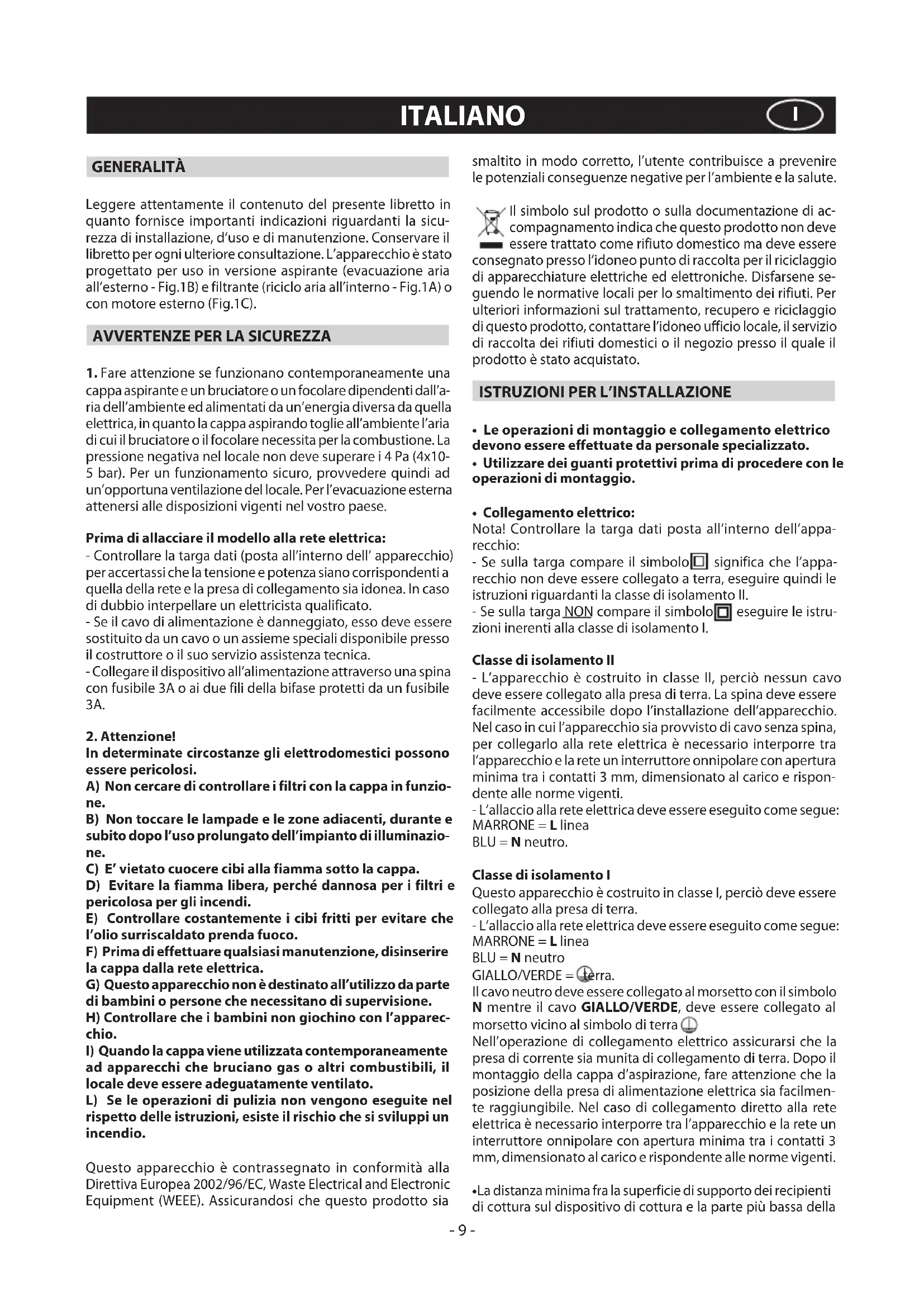ad apparecchi che bruciano gas o altri combustibili, il locale deve essere adeguatamente ventilato. L) Se le operazioni di pulizia non vengono eseguite nel rispetto delle istruzioni, esiste il rischio che si sviluppi un incendio. Questo apparecchio è contrassegnato in conformità alla Direttiva Europea 2002/96/EC, Waste Electrical and Electronic Equipment (WEEE). Assicurandosi che questo prodotto sia smaltito in modo corretto, l’utente contribuisce a prevenire le potenziali conseguenze negative per l’ambiente e la salute. Il simbolo sul prodotto o sulla documentazione di ac- compagnamento indica che questo prodotto non deve essere trattato come rifiuto domestico ma deve essere consegnato presso l’idoneo punto di raccolta per il riciclaggio di apparecchiature elettriche ed elettroniche. Disfarsene se- guendo le normative locali per lo smaltimento dei rifiuti. Per ulteriori informazioni sul trattamento, recupero e riciclaggio di questo prodotto, contattare l’idoneo ufficio locale, il servizio di raccolta dei rifiuti domestici o il negozio presso il quale il prodotto è stato acquistato.