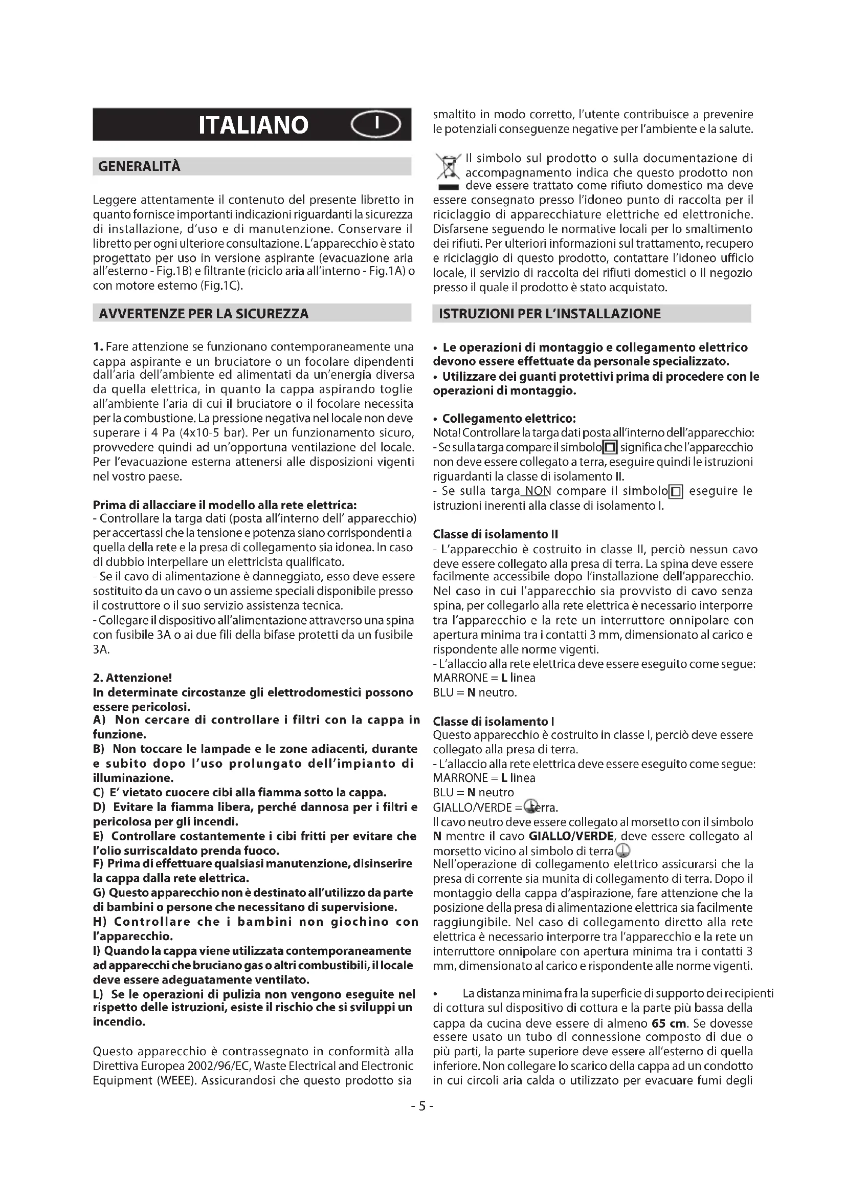 - Collegamentoelettrico: Nota! Controllare la targa dati posta all’interno dell’apparecchio: - Se sulla targa compare il simbolo significa che l’apparecchio non deve essere collegato a terra, eseguire quindi le istruzioni riguardanti la classe di isolamento II. - Se sulla targa NON compare il simbolo eseguire le istruzioni inerenti alla classe di isolamento I. Classe di isolamento II - L’apparecchio è costruito in classe II, perciò nessun cavo deve essere collegato alla presa di terra. La spina deve essere facilmente accessibile dopo l’installazione dell’apparecchio. Nel caso in cui l’apparecchio sia provvisto di cavo senza spina, per collegarlo alla rete elettrica è necessario interporre tra l’apparecchio e la rete un interruttore onnipolare con apertura minima tra i contatti 3 mm, dimensionato al carico e rispondente alle norme vigenti. - L’allaccio alla rete elettrica deve essere eseguito come segue: MARRONE = L linea BLU = N neutro. Classe di isolamento I Questo apparecchio è costruito in classe I, perciò deve essere collegato alla presa di terra. - L’allaccio alla rete elettrica deve essere eseguito come segue: MARRONE = L linea BLU = N neutro GIALLO/VERDE = terra. Il cavo neutro deve essere collegato al morsetto con il simbolo N mentre il cavo GIALLO/VERDE, deve essere collegato al morsetto vicino al simbolo di terra . Nell’operazione di collegamento elettrico assicurarsi che la presa di corrente sia munita di collegamento di terra. Dopo il montaggio della cappa d’aspirazione, fare attenzione che la posizione della presa di alimentazione elettrica sia facilmente raggiungibile. Nel caso di collegamento diretto alla rete elettrica è necessario interporre tra l’apparecchio e la rete un interruttore onnipolare con apertura minima tra i contatti 3 mm, dimensionato al carico e rispondente alle norme vigenti.