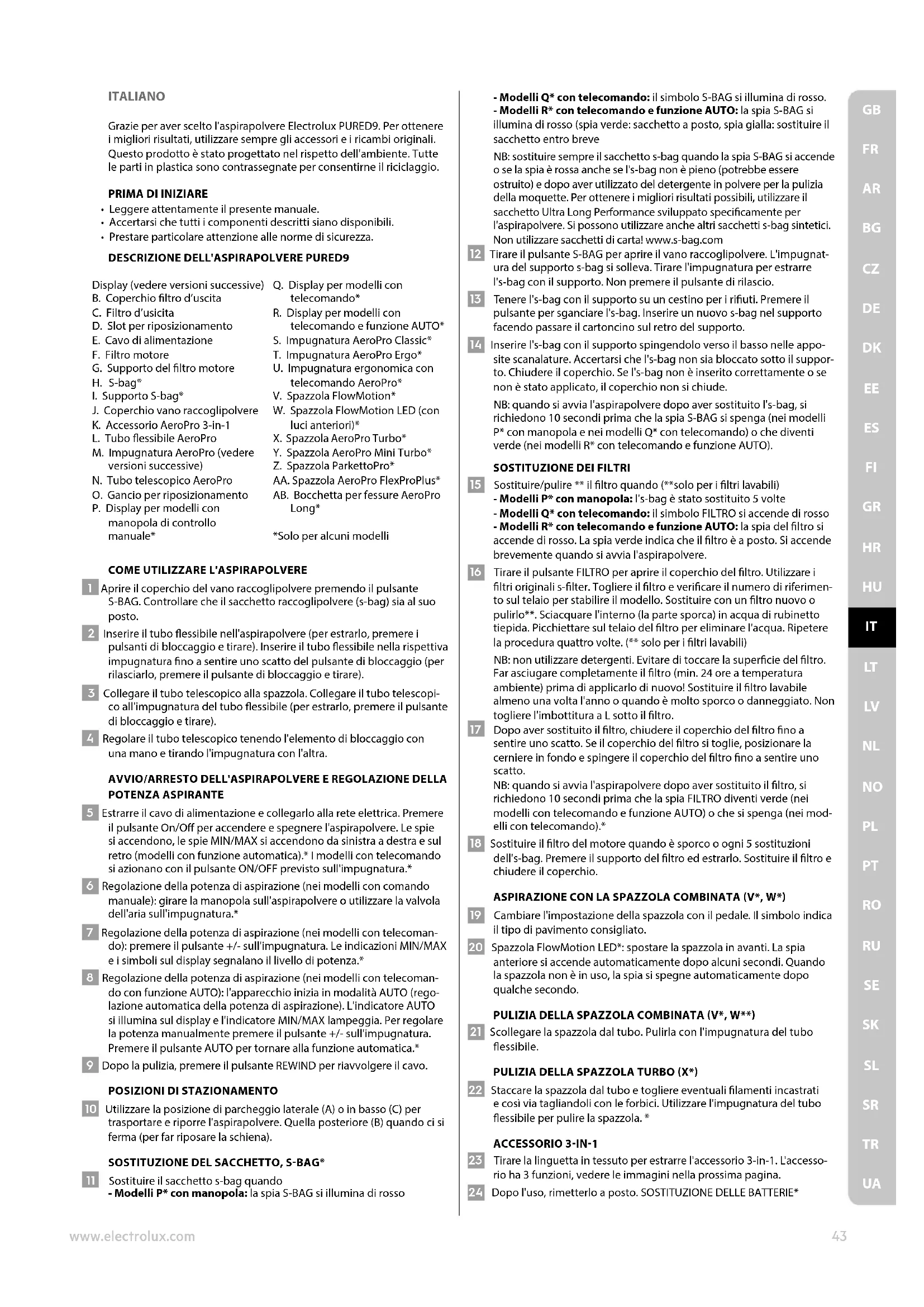 UAITALIANO Grazie per aver scelto l'aspirapolvere Electrolux PURED9. Per ottenere i migliori risultati, utilizzare sempre gli accessori e i ricambi originali. Questo prodotto è stato progettato nel rispetto dell'ambiente. Tutte le parti in plastica sono contrassegnate per consentirne il riciclaggio.