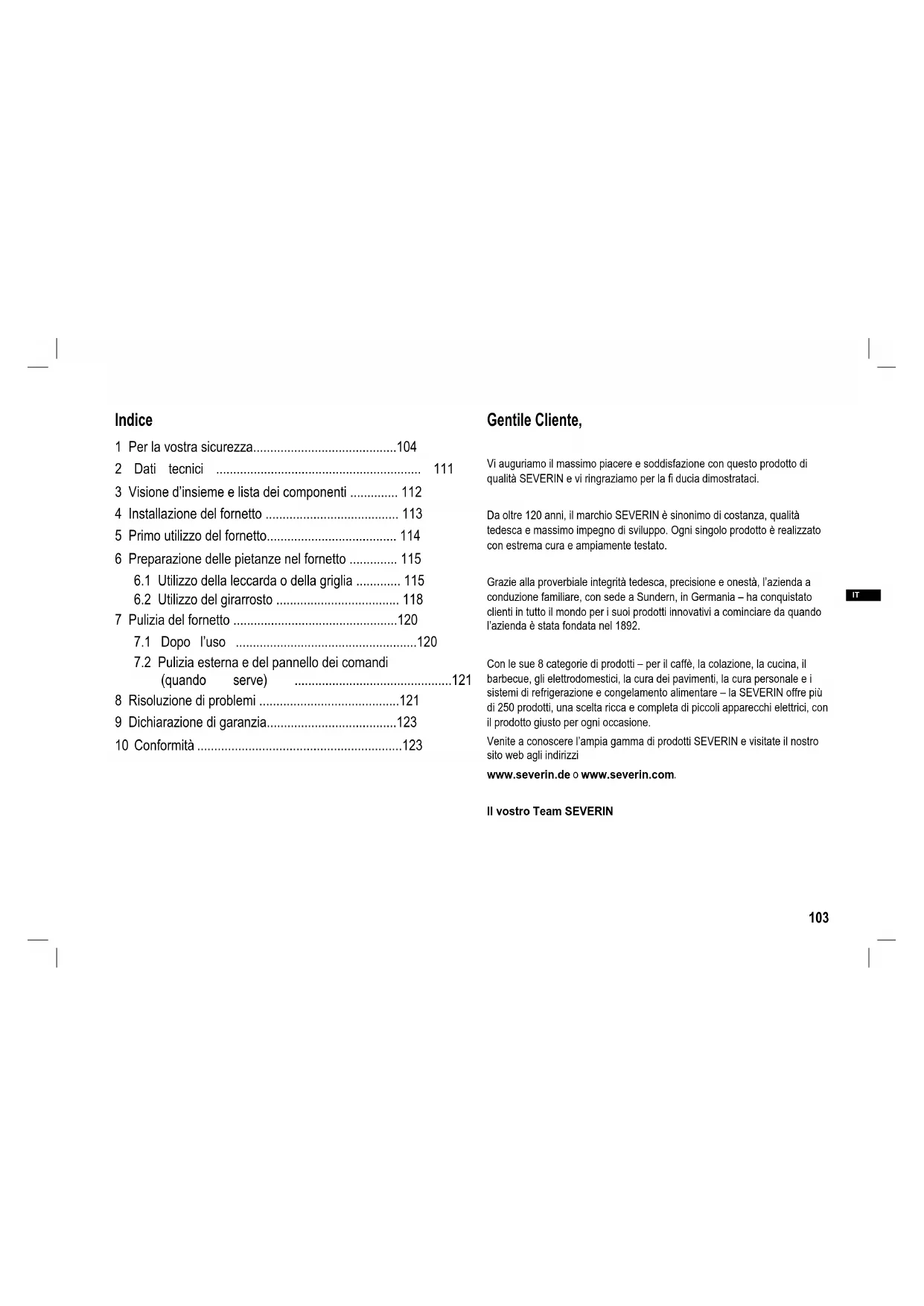- Il fornetto non contiene nessun componente su cui potete fare manutenzione o riparazioni da soli. Le riparazioni devono essere apportate dal Centro Assistenza della SEVERIN.111