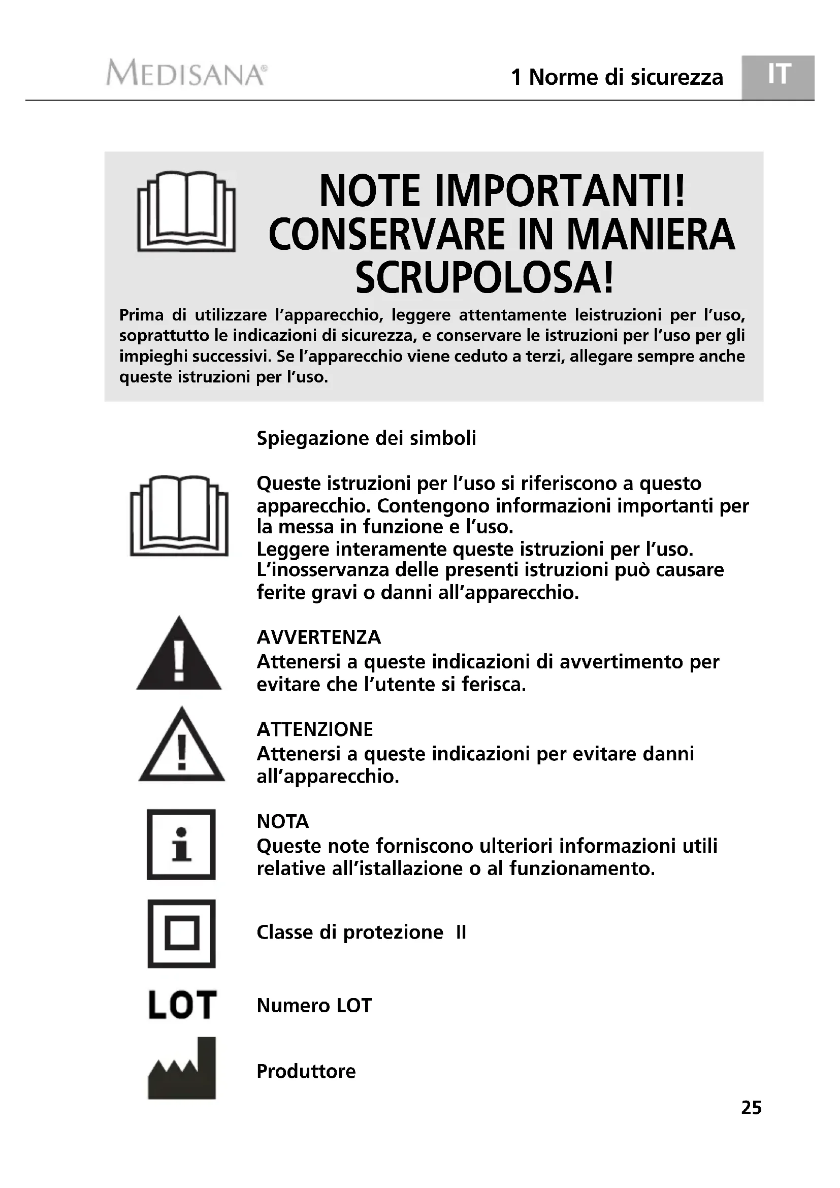 Per ottenere il successo desiderato e poter utilizzare a lungo il Suo Medistyle MEDISANA, Le consigliamo di leggere accuratamente le seguenti istruzioni per l'uso e la manutenzione.
