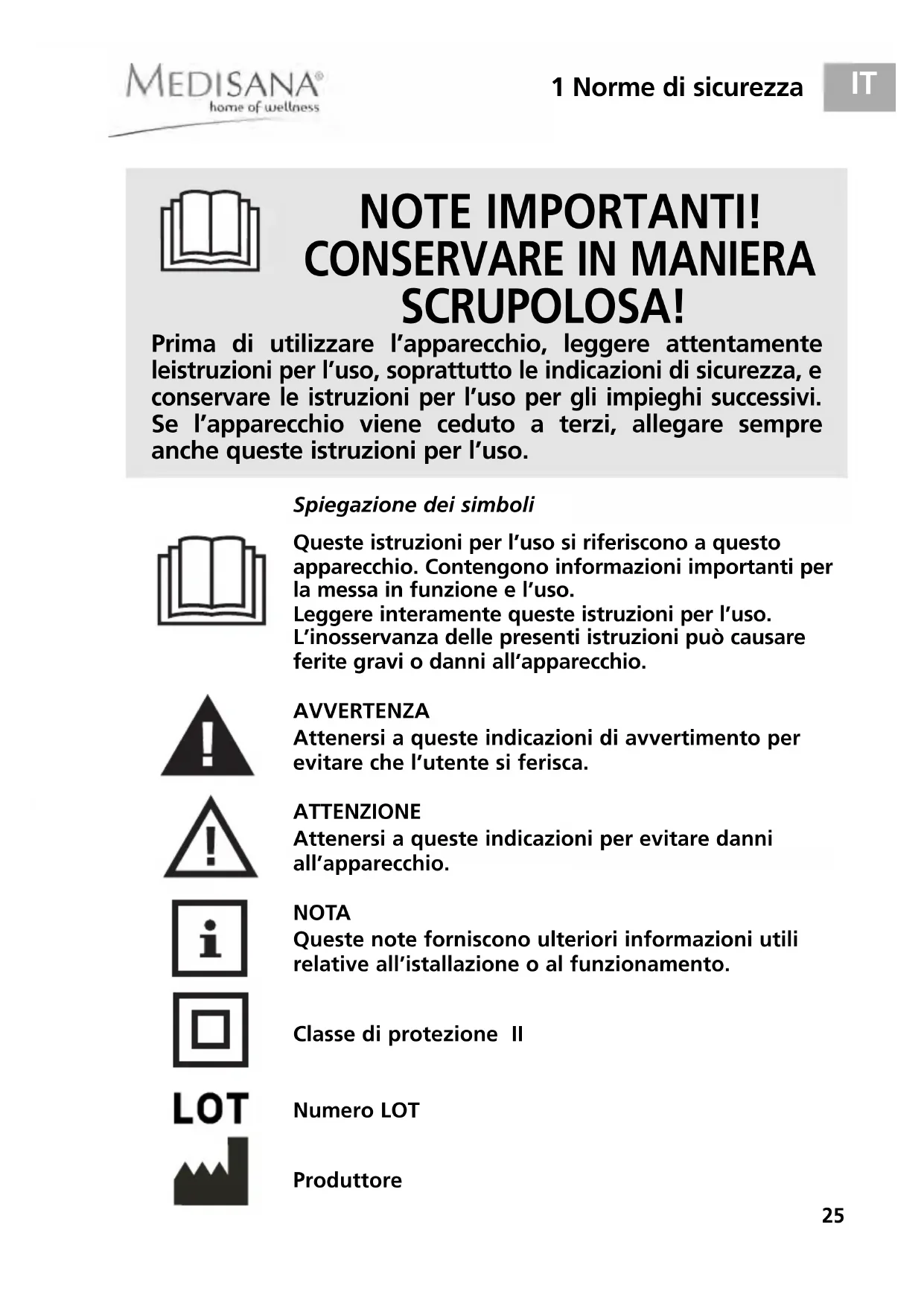 - I prodotti MEDISANA hanno una garanzia di tre anni a partire nella data di vendita. La data di acquisito deve essere comprovata in caso di garanzia alla ricevuta di acquisito o alla fattura.