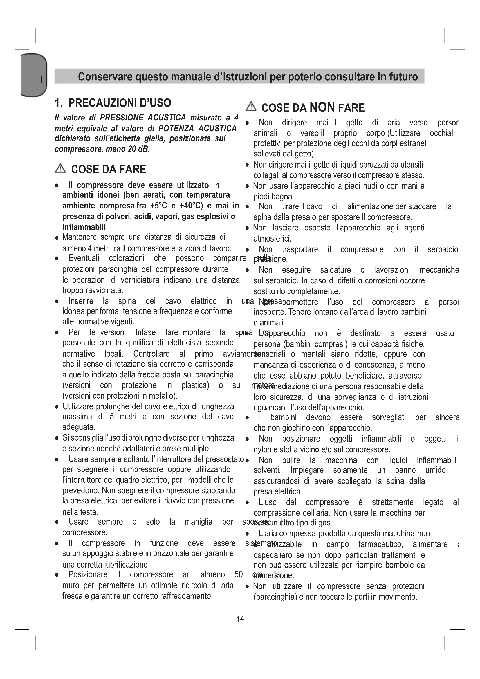 Non dirigere mai il getto di liquidi spruzzati da utensili collegatialcompressoreversoilcompressorestesso. ● Nonusarel’apparecchioapiedinudioconmanie piedibagnati. ● Non tirareilcavo di alimentazioneperstaccare la spinadallapresaoperspostareilcompressore. ● Non lasciare esposto l’apparecchio agli agenti atmosferici. ● Non trasportare il compressore con il serbatoio in pressione. ● Non eseguire saldature o lavorazioni meccaniche sulserbatoio.Incasodidifettiocorrosionioccorre sostituirlocompletamente. ● Non permettere l’uso del compressore a persone inesperte.Tenerelontanodall’areadilavorobambini eanimali. ● L’apparecchio non è destinato a essere usato da persone(bambinicompresi)lecuicapacitàfisiche, sensoriali o mentali siano ridotte, oppure con mancanza di esperienza o di conoscenza, a meno che esse abbiano potuto beneficiare, attraverso l’intermediazione di una persona responsabile della loro sicurezza, di una sorveglianza o di istruzioni riguardantil’usodell’apparecchio. ● I bambini devono essere sorvegliati per sincerarsi chenongiochinoconl’apparecchio. ● Non posizionare oggetti infiammabili o oggetti in nylonestoffavicinoe/osulcompressore. ● Non pulire la macchina con liquidi infiammabili o solventi. Impiegare solamente un panno umido assicurandosi di avere scollegato la spina dalla presaelettrica. ● L’uso del compressore è strettamente legato alla compressionedell’aria.Nonusarelamacchinaper nessunaltrotipodigas. ● L’ariacompressaprodottadaquestamacchinanon è utilizzabile in campo farmaceutico, alimentare o ospedaliero se non dopo particolari trattamenti e non può essere utilizzata per riempire bombole da immersione. ● Non utilizzare il compressore senza protezioni (paracinghia)enontoccarelepartiinmovimento.I