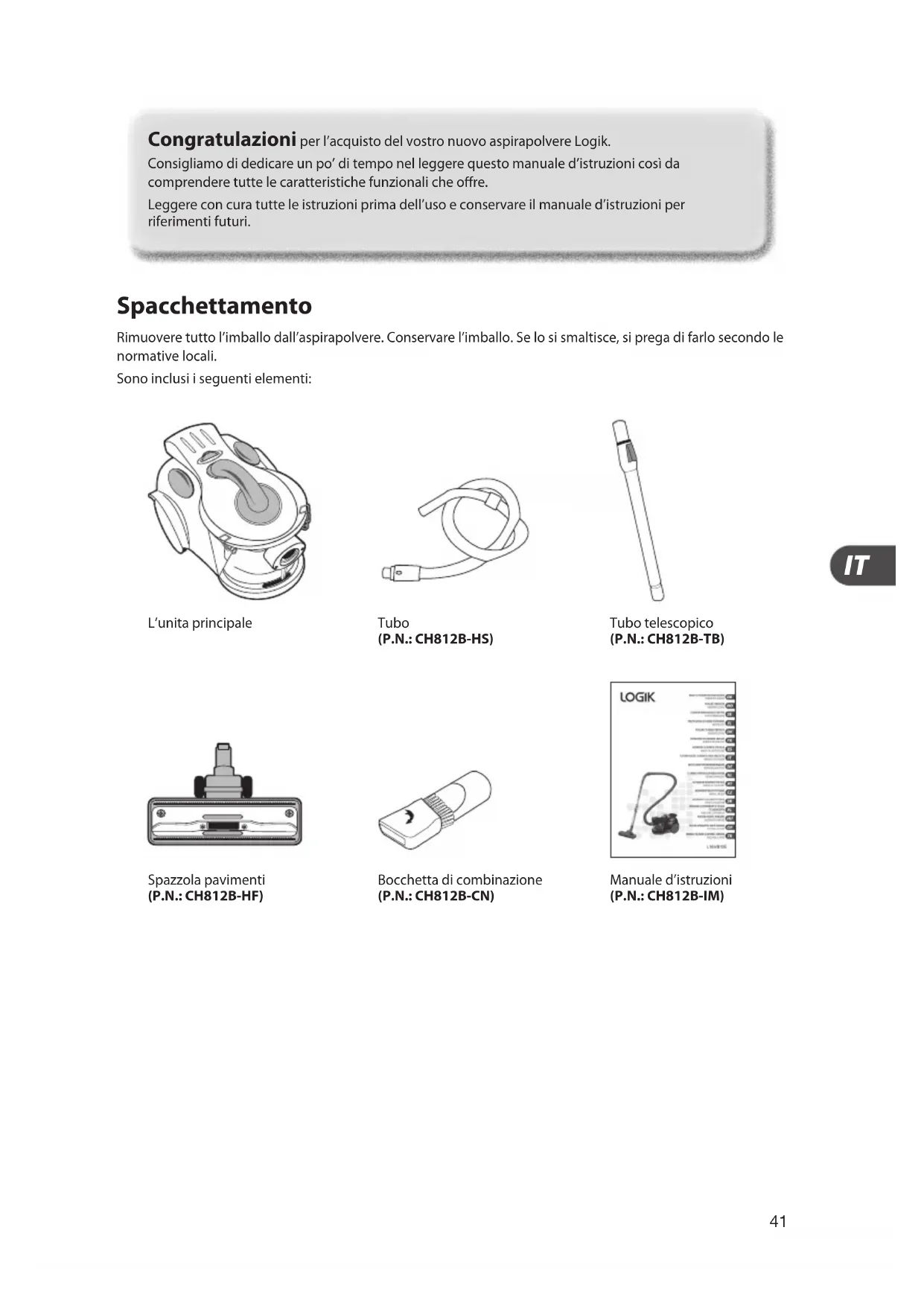 Spacchettamento Rimuovere tutto l’imballo dall’aspirapolvere. Conservare l’imballo. Se lo si smaltisce, si prega di farlo secondo le normative locali. Sono inclusi i seguenti elementi: Congratulazioni per l’acquisto del vostro nuovo aspirapolvere Logik. Consigliamo di dedicare un po’ di tempo nel leggere questo manuale d’istruzioni così da comprendere tutte le caratteristiche funzionali che ore. Leggere con cura tutte le istruzioni prima dell’uso e conservare il manuale d’istruzioni per riferimenti futuri. L’unita principale Spazzola pavimenti (P.N.: CH812B-HF) Tubo (P.N.: CH812B-HS) Bocchetta di combinazione (P.N.: CH812B-CN) Tubo telescopico (P.N.: CH812B-TB) Manuale d’istruzioni (P.N.: CH812B-IM)42