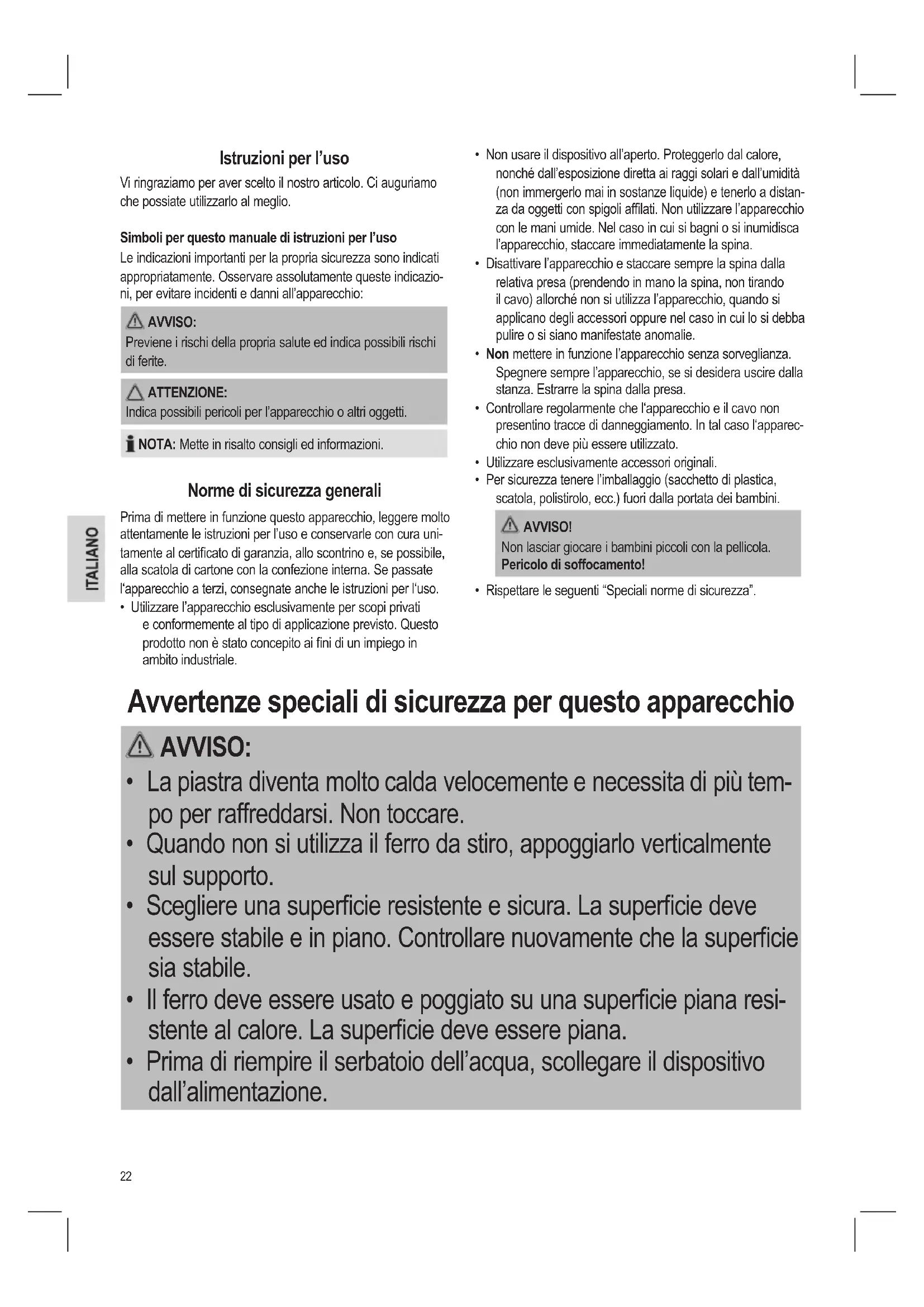 - Quando si accende o si raffredda il ferro da stiro e il cavo devono essre fuori dalla portata dei bambini minori di 8 anni.