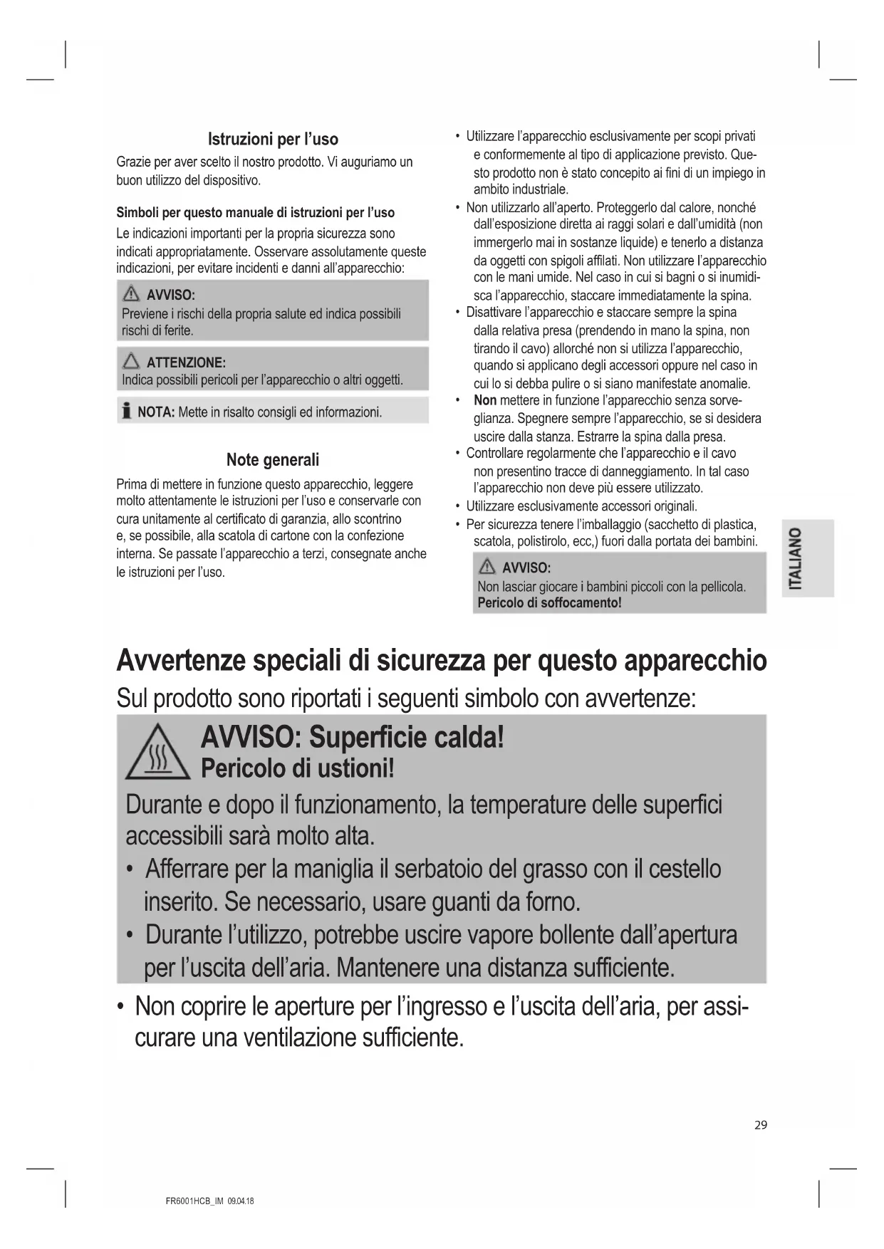chio. Restituirlo immediatamente al rivenditore. Elementi di comando / Nella fornitura 1 Bocchette d’uscita dell’aria 2 Aperture per l’ingresso dell’aria 3 Spia indicatrice di funzionamento 4 Interruttore acceso / spento / timer 5 Controllo di temperatura 6 Cestello 7 Protezione per il pulsante di rilascio 8 Pulsante di rilascio 9 Maniglia del cestello 10 Serbatoio raccogli-grassoFR6001HCB_IM 09.04.18