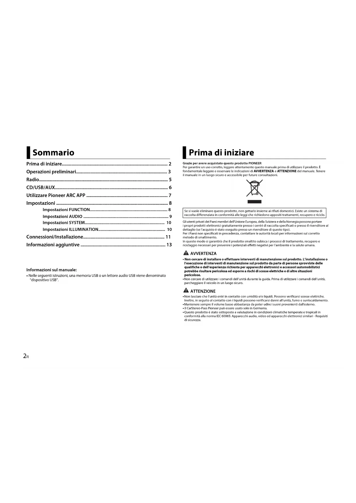 - Nelle seguenti istruzioni, una memoria USB o un lettore audio USB viene denominato “dispositivo USB”. Sommario Grazie per avere acquistato questo prodotto PIONEERPer garantire un uso corretto, leggere attentamente questo manuale prima di utilizzare il prodotto. È fondamentale leggere e osservare le indicazioni di AVVERTENZA e AT T E NZ I O N E del manuale. Tenere il manuale in un luogo sicuro e accessibile per future consultazioni.Gli utenti privati dei Paesi membri dell’Unione Europea, della Svizzera e della Norvegia possono portare i propri prodotti elettronici gratuitamente presso i centri di raccolta specificati o presso il rivenditore al dettaglio (se l’acquisto è stato eseguito presso un rivenditore di questo tipo).Per i Paesi non specificati in precedenza, contattare le autorità locali per informazioni sul corretto metodo di smaltimento.In questo modo si garantirà che il prodotto smaltito subisca i processi di trattamento, recupero e riciclaggio necessari per prevenire i potenziali effetti negativi per l’ambiente e la salute umana. AVVERTENZA