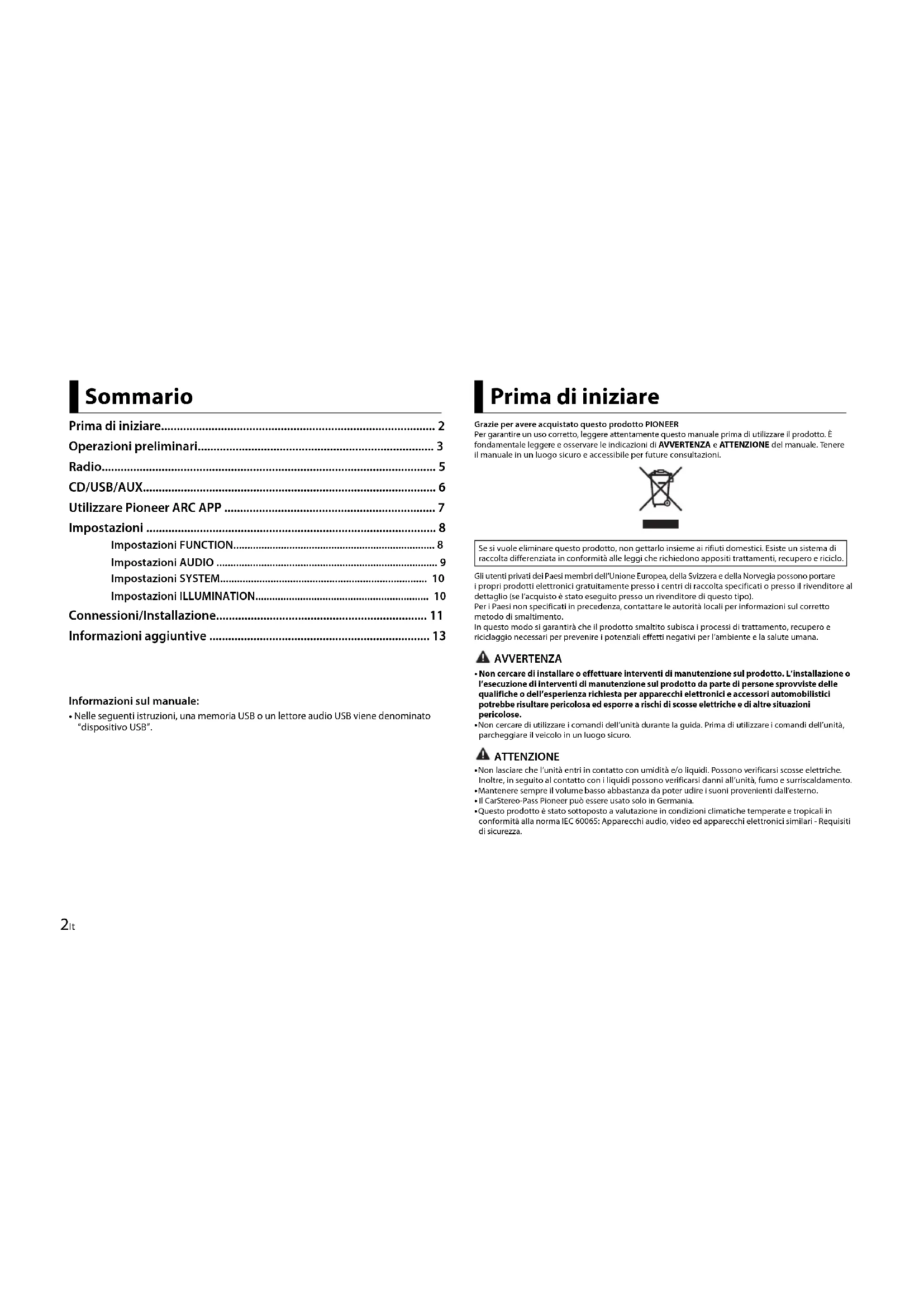 - Nelle seguenti istruzioni, una memoria USB o un lettore audio USB viene denominato “dispositivo USB”. Sommario Grazie per avere acquistato questo prodotto PIONEERPer garantire un uso corretto, leggere attentamente questo manuale prima di utilizzare il prodotto. È fondamentale leggere e osservare le indicazioni di AVVERTENZA e AT T E NZ I O N E del manuale. Tenere il manuale in un luogo sicuro e accessibile per future consultazioni.Gli utenti privati dei Paesi membri dell’Unione Europea, della Svizzera e della Norvegia possono portare i propri prodotti elettronici gratuitamente presso i centri di raccolta specificati o presso il rivenditore al dettaglio (se l’acquisto è stato eseguito presso un rivenditore di questo tipo).Per i Paesi non specificati in precedenza, contattare le autorità locali per informazioni sul corretto metodo di smaltimento.In questo modo si garantirà che il prodotto smaltito subisca i processi di trattamento, recupero e riciclaggio necessari per prevenire i potenziali effetti negativi per l’ambiente e la salute umana. AVVERTENZA