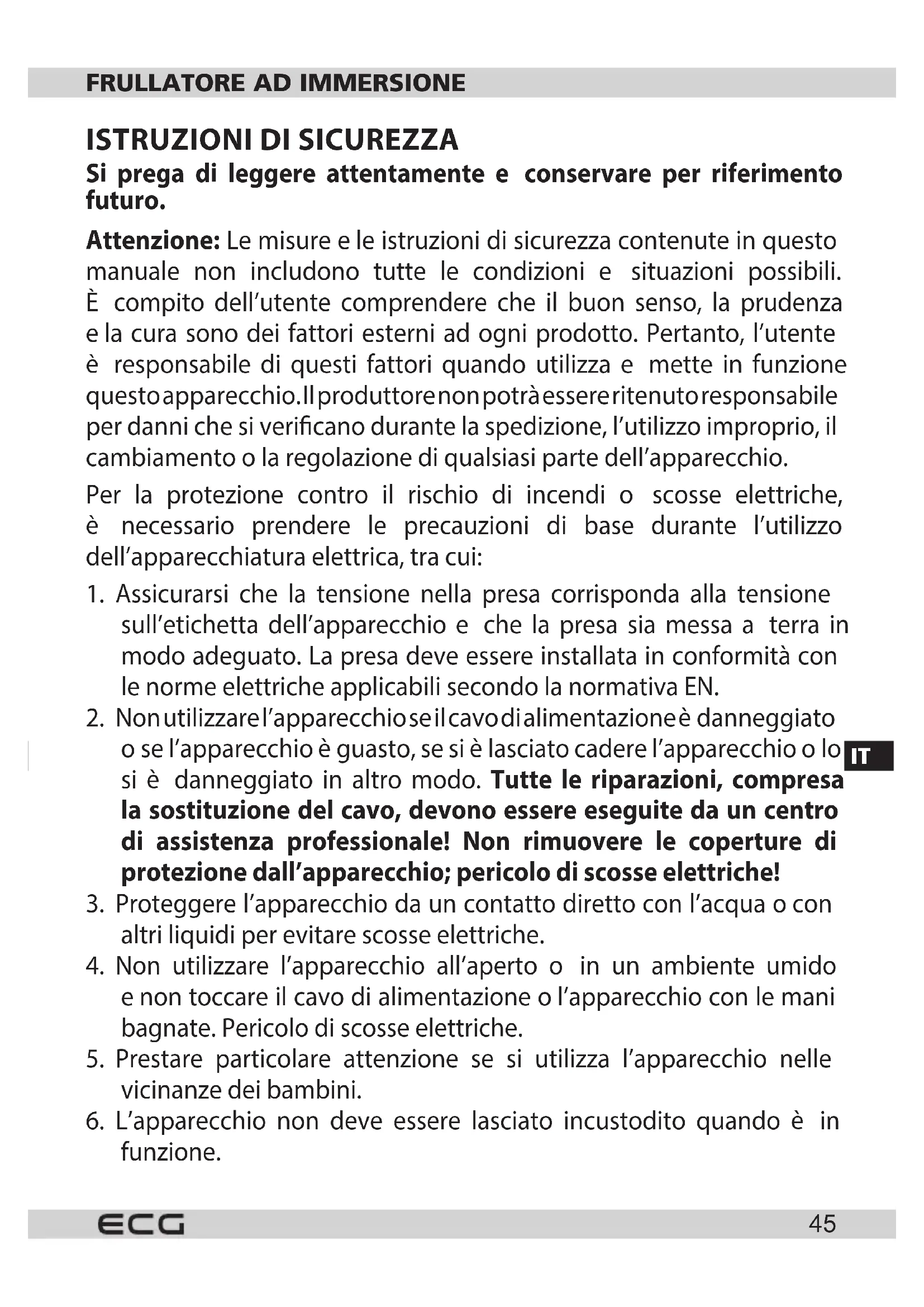 Si prega di leggere attentamente e conservare per riferimento futuro. Attenzione: Le misure ele istruzioni di sicurezza contenute in questo manuale non includono tutte le condizioni e situazioni possibili. È compito dell’utente comprendere che il buon senso, la prudenza ela cura sono dei fattori esterni ad ogni prodotto. Pertanto, l’utente è responsabile di questi fattori quando utilizza e mette in funzione questo apparecchio. Il produttore non potrà essere ritenuto responsabile per danni che si vericano durante la spedizione, l’utilizzo improprio, il cambiamento ola regolazione di qualsiasi parte dell’apparecchio. Per la protezione contro il rischio di incendi o scosse elettriche, è necessario prendere le precauzioni di base durante l’utilizzo dell’apparecchiatura elettrica, tra cui: