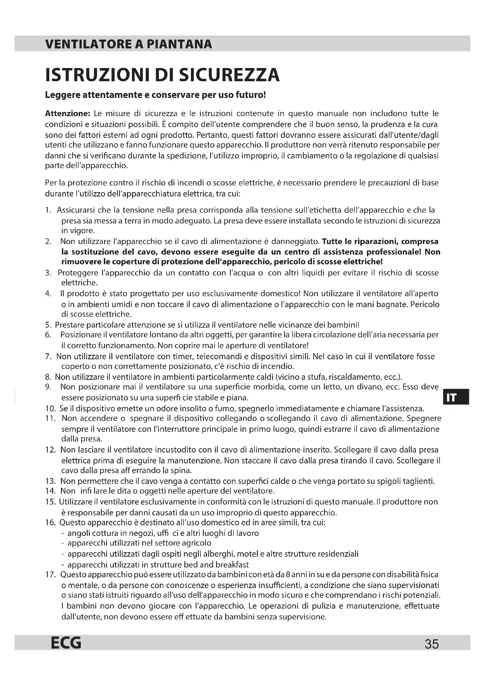 4. Il prodotto èstato progettato per uso esclusivamente domestico! Non utilizzare il ventilatore all’aperto