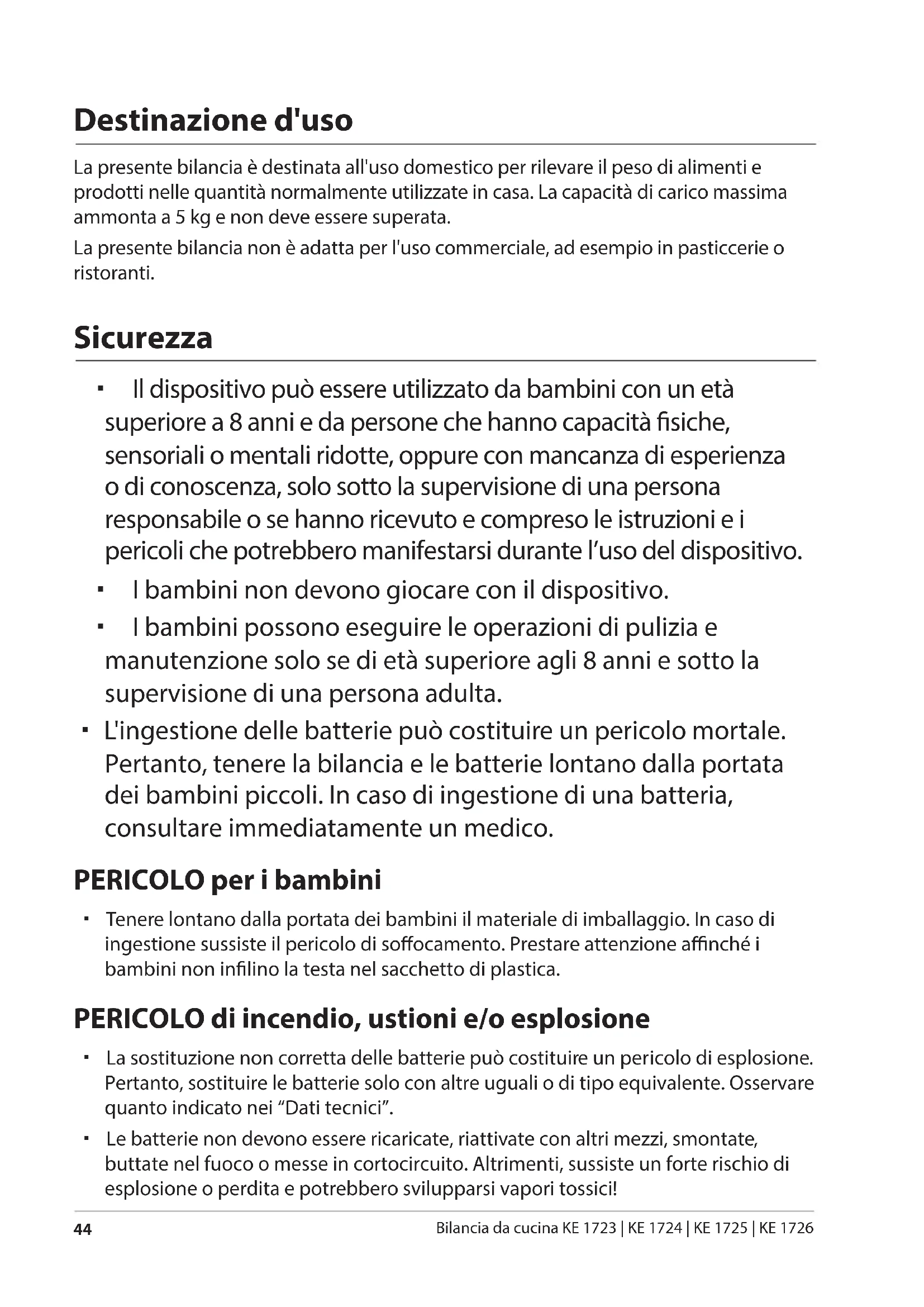 La presente bilancia è destinata all'uso domestico per rilevare il peso di alimenti e prodotti nelle quantità normalmente utilizzate in casa. La capacità di carico massima ammonta a 5 kg e non deve essere superata.
