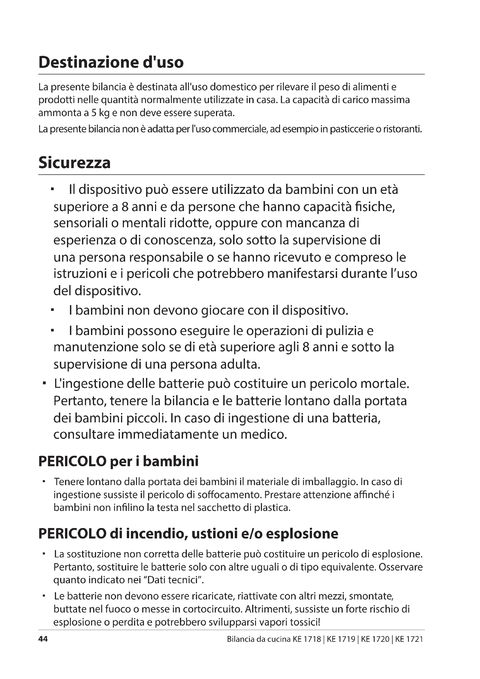 La presente bilancia è destinata all'uso domestico per rilevare il peso di alimenti e prodotti nelle quantità normalmente utilizzate in casa. La capacità di carico massima ammonta a 5 kg e non deve essere superata.