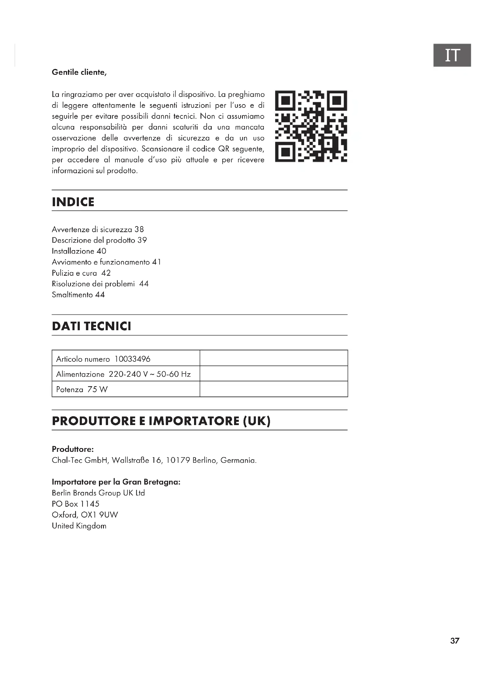 Gentile cliente, La ringraziamo per aver acquistato il dispositivo. La preghiamo di leggere attentamente le seguenti istruzioni per l’uso e di seguirle per evitare possibili danni tecnici. Non ci assumiamo alcuna responsabilità per danni scaturiti da una mancata osservazione delle avvertenze di sicurezza e da un uso improprio del dispositivo. Scansionare il codice QR seguente, per accedere al manuale d’uso più attuale e per ricevere informazioni sul prodotto. INDICE Avvertenze di sicurezza38 Descrizione del prodotto39 Installazione40 Avviamento e funzionamento41 Pulizia e cura 42 Risoluzione dei problemi 44 Smaltimento44 DATI TECNICI Articolo numero 10033496 Alimentazione 220-240 V ~ 50-60 Hz Potenza 75 W PRODUTTORE E IMPORTATORE (UK) Produttore: Chal-Tec GmbH, Wallstraße 16, 10179 Berlino, Germania. Importatore per la Gran Bretagna: Berlin Brands Group UK Ltd PO Box 1145 Oxford, OX1 9UW United Kingdom38