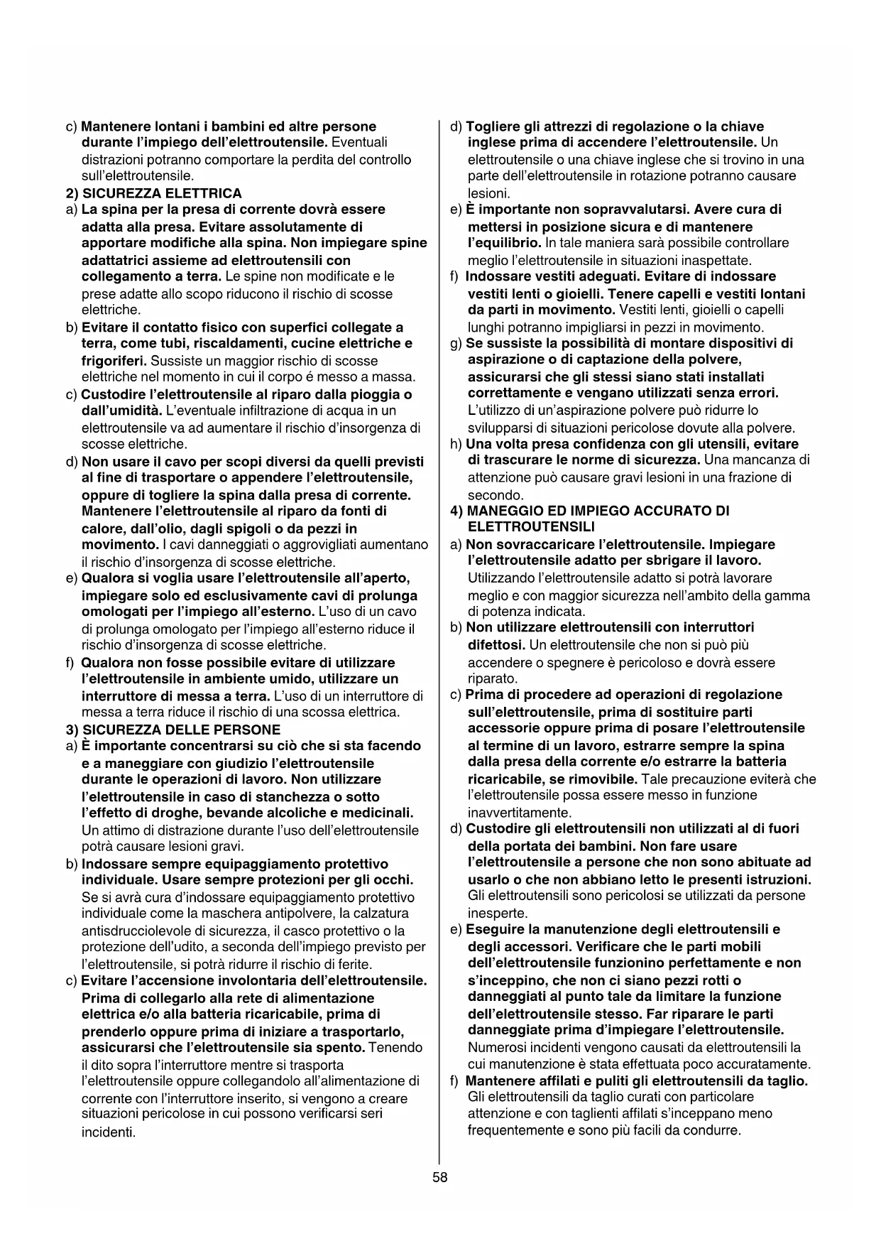 a) Mantenere pulito ed ordinato il posto di lavoro. Il disordine o le zone di lavoro non illuminate possono essere fonte di incidenti. b) Evitare d’impiegare l’elettroutensile in ambienti soggetti al rischio di esplosioni nei quali si trovino liquidi, gas o polveri infiammabili. Gli elettroutensili producono scintille che possono far inammare la polvere o i gas.58 c) Mantenere lontani i bambini ed altre persone durante l’impiego dell’elettroutensile. Eventuali distrazioni potranno comportare la perdita del controllo sull’elettroutensile.