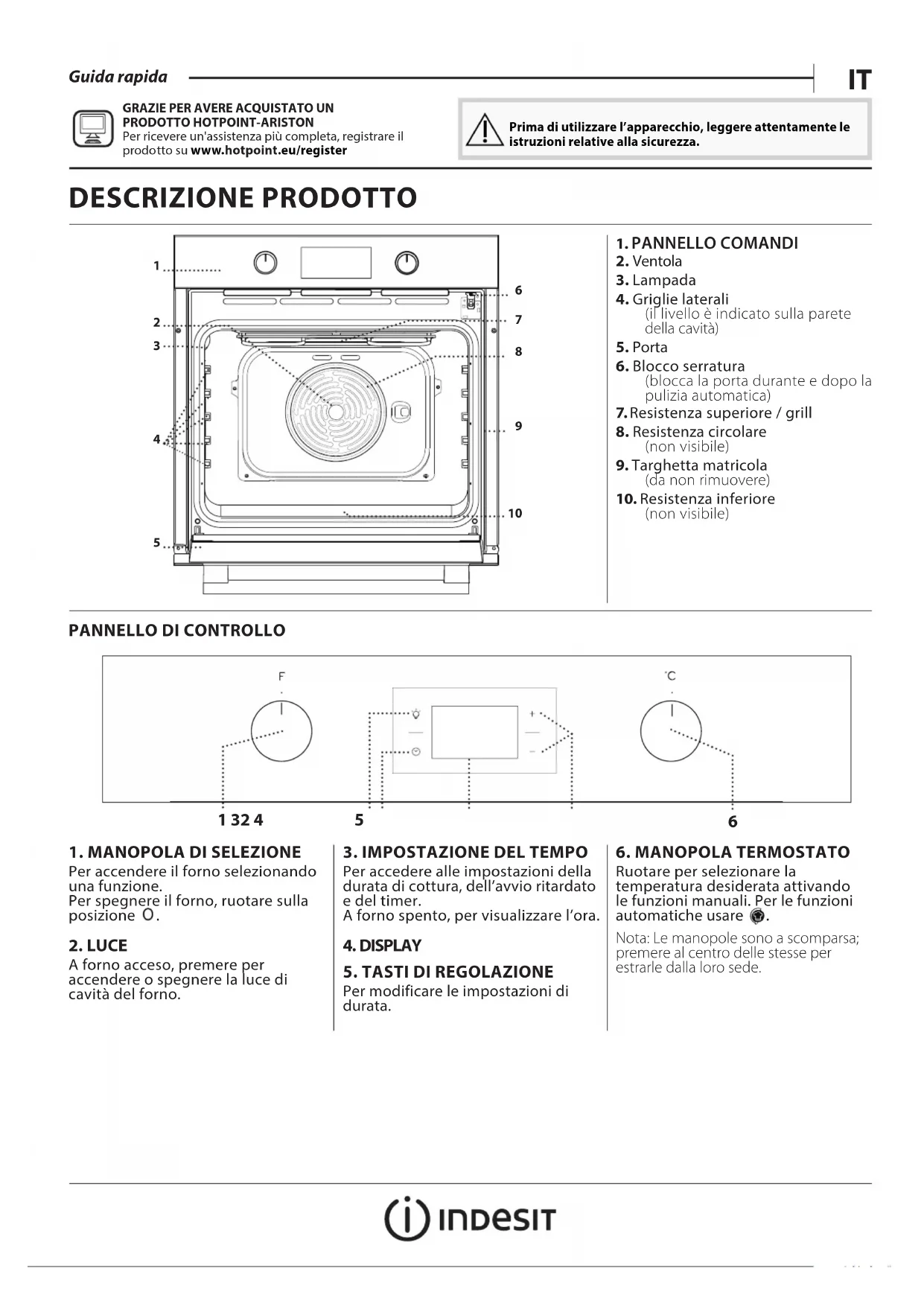 Per ricevere un'assistenza più completa, registrare il prodotto su www . hotpoint . eu/ register Prima di utilizzare l’apparecchio, leggere attentamente le istruzioni relative alla sicurezza.STATICO Per cuocere qualsiasi tipo di pietanza su un solo ripiano. MULTILIVELLO Per cuocere contemporaneamente su più ripiani (massimo tre) alimenti, anche diversi, che richiedono medesima temperatura di cottura. La funzione permette di cuocere senza trasmissione di odori da un alimento all’altro. XL COOKING Per cuocere carni di grosse dimensioni (superiori ai 2,5 kg). Si raccomanda di girare la carne durante la cottura per farla rosolare su tutti i lati. Si consiglia inoltre di irrorare la carne di tanto in tanto per evitare che asciughi eccessivamente. PIZZA Per cuocere diversi tipi e formati di pizza e focaccia. Si consiglia di invertire la posizione delle teglie a metà cottura. GRILL Per grigliare costate, spiedini e salsicce, gratinare verdure o dorare il pane. Quando si cuoce la carne alla griglia, si consiglia di utilizzare una leccarda per raccogliere il liquido di cottura: posizionarla un livello sotto la griglia e aggiungere 200 ml di acqua potabile. GRATIN Per arrostire grossi pezzi di carne (cosciotti, roast beef, polli). Si consiglia di utilizzare una leccarda per raccogliere il liquido di cottura: posizionarla un livello sotto la griglia e aggiungere 200 ml di acqua potabile. ACCESSORI Per maggiori informazioni, scaricare le istruzioni per l’uso da docs.indesit.eu WWW GRIGLIA LECCARDA (SE PRESENTE) TEGLIA GUIDE SCORREVOLI Il numero e il tipo di accessori possono variare a seconda del modello acquistato. È possibile acquistare separatamente altri accessori presso il Servizio Assistenza Clienti.