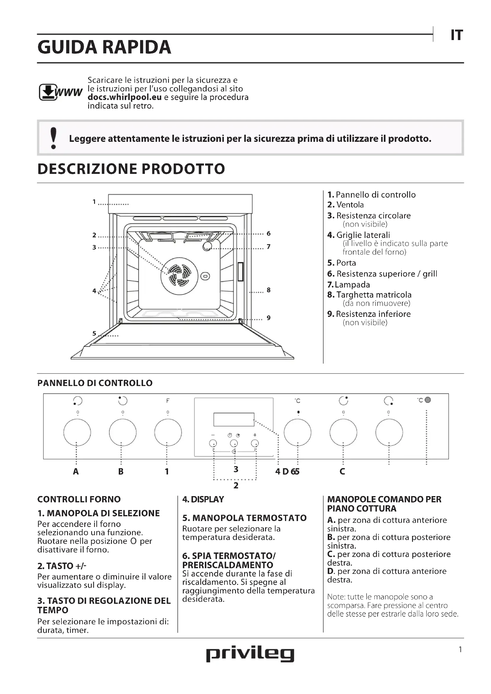 PIANO COTTURA A. per zona di cottura anterioresinistra.B. per zona di cottura posterioresinistra.C. per zona di cottura posterioredestra.D. per zona di cottura anterioredestra.Note: tutte le manopole sono a scomparsa. Fare pressione al centro delle stesse per estrarle dalla loro sede. GUIDA RAPIDA Leggere attentamente le istruzioni per la sicurezza prima di utilizzare il prodotto. WWW Scaricare le istruzioni per la sicurezza e le istruzioni per l’uso collegandosi al sito docs.whirlpool.eu e seguire la procedura indicata sul retro.