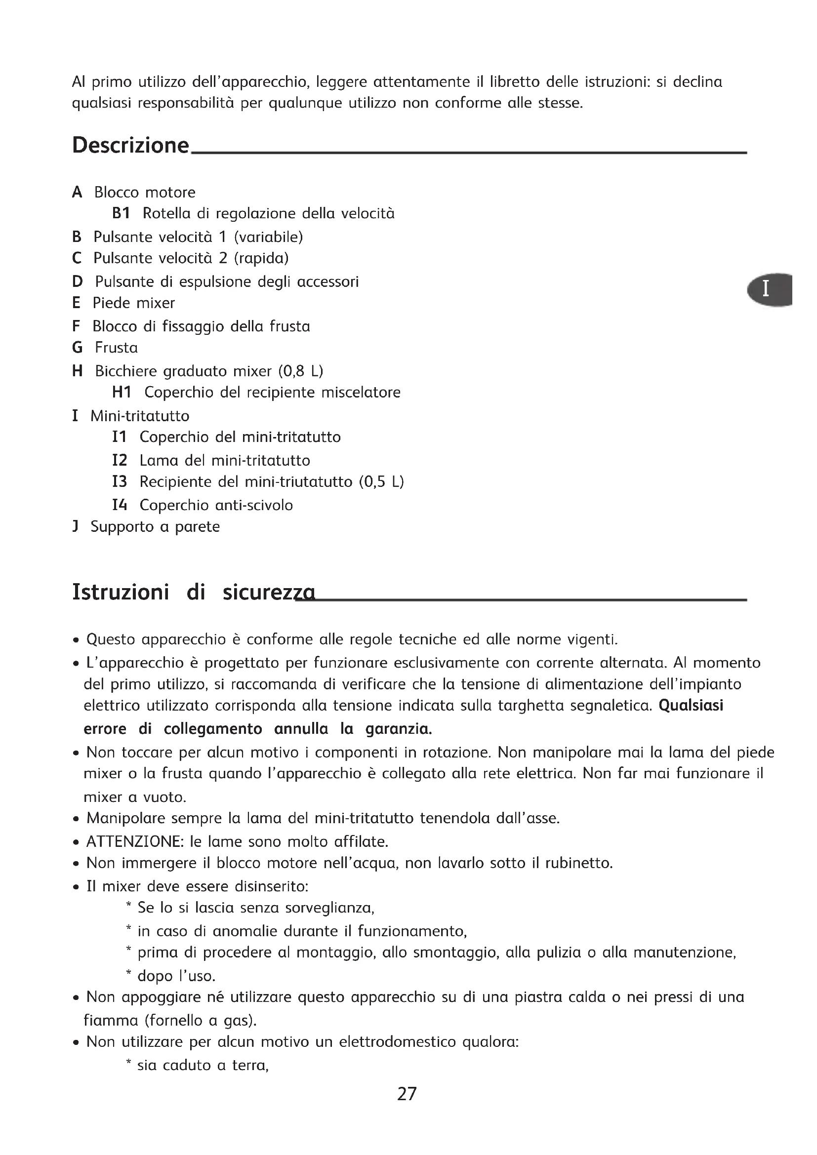 mixeur big ben jamie oliver:Mixeur big ben jamie oliver 10/04/09 9:57 Page 2627 Al primo utilizzo dell’apparecchio, leggere attentamente il libretto delle istruzioni: si declina qualsiasi responsabilità per qualunque utilizzo non conforme alle stesse. Descrizione A Blocco motore B1 Rotella di regolazione della velocità B Pulsante velocità 1 (variabile) C Pulsante velocità 2 (rapida) D Pulsante di espulsione degli accessori E Piede mixer F Blocco di fissaggio della frusta G Frusta H Bicchiere graduato mixer (0,8 L) H1 Coperchio del recipiente miscelatore I Mini-tritatutto I1 Coperchio del mini-tritatutto I2 Lama del mini-tritatutto I3 Recipiente del mini-triutatutto (0,5 L) I4 Coperchio anti-scivolo J Supporto a parete Istruzioni di sicurezza