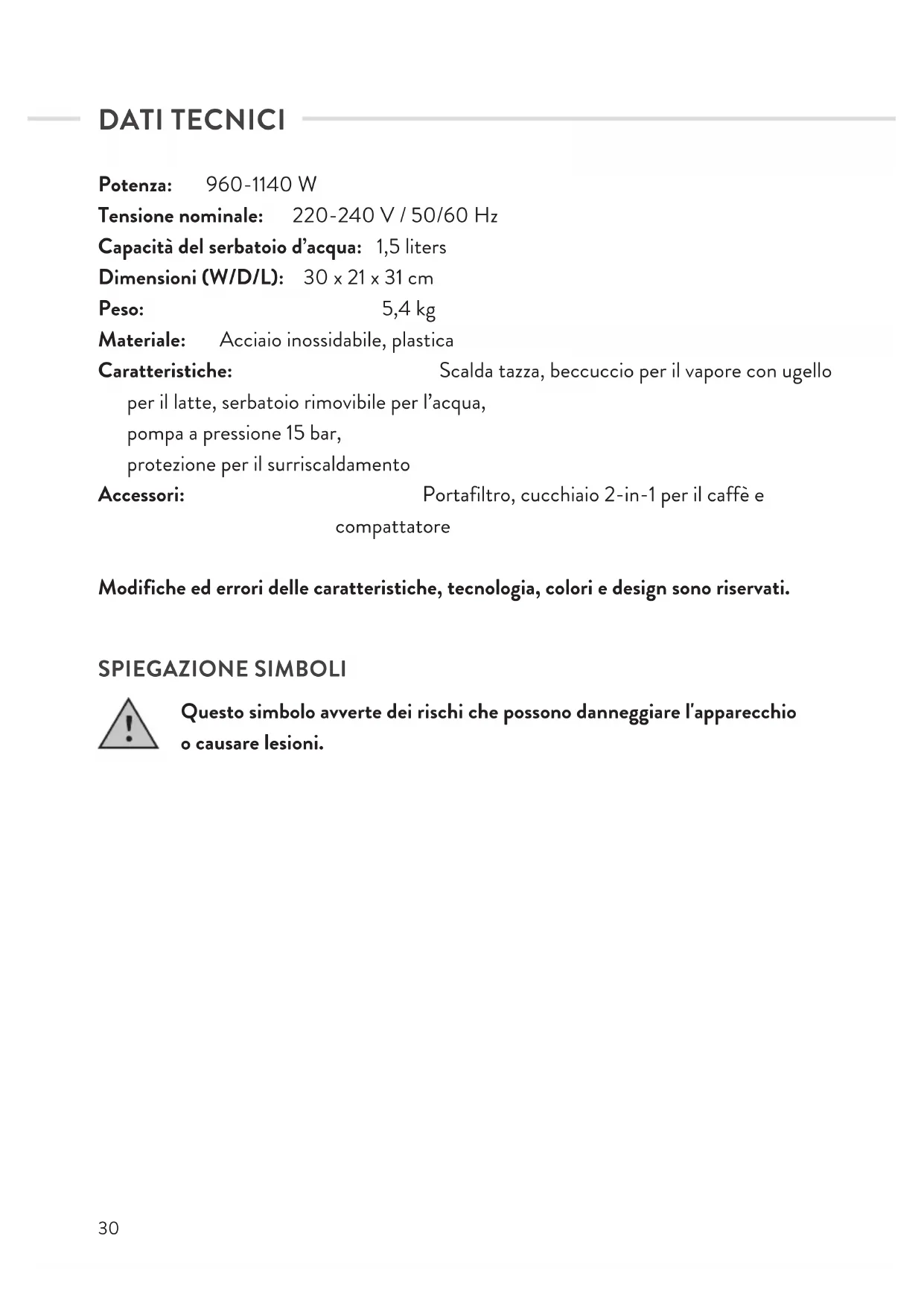 Non utilizzato la macchina espresso, gli accessori o il cavo di alimentazione sequesti sono danneggiati. In tal caso, siete pregati di contattare il servizio consumatori. - Assicurarsi che la macchina espresso sia posizionata su una superficie pianà non riscaldata e che non ci siano fiamme libere nelle vicinanze.
