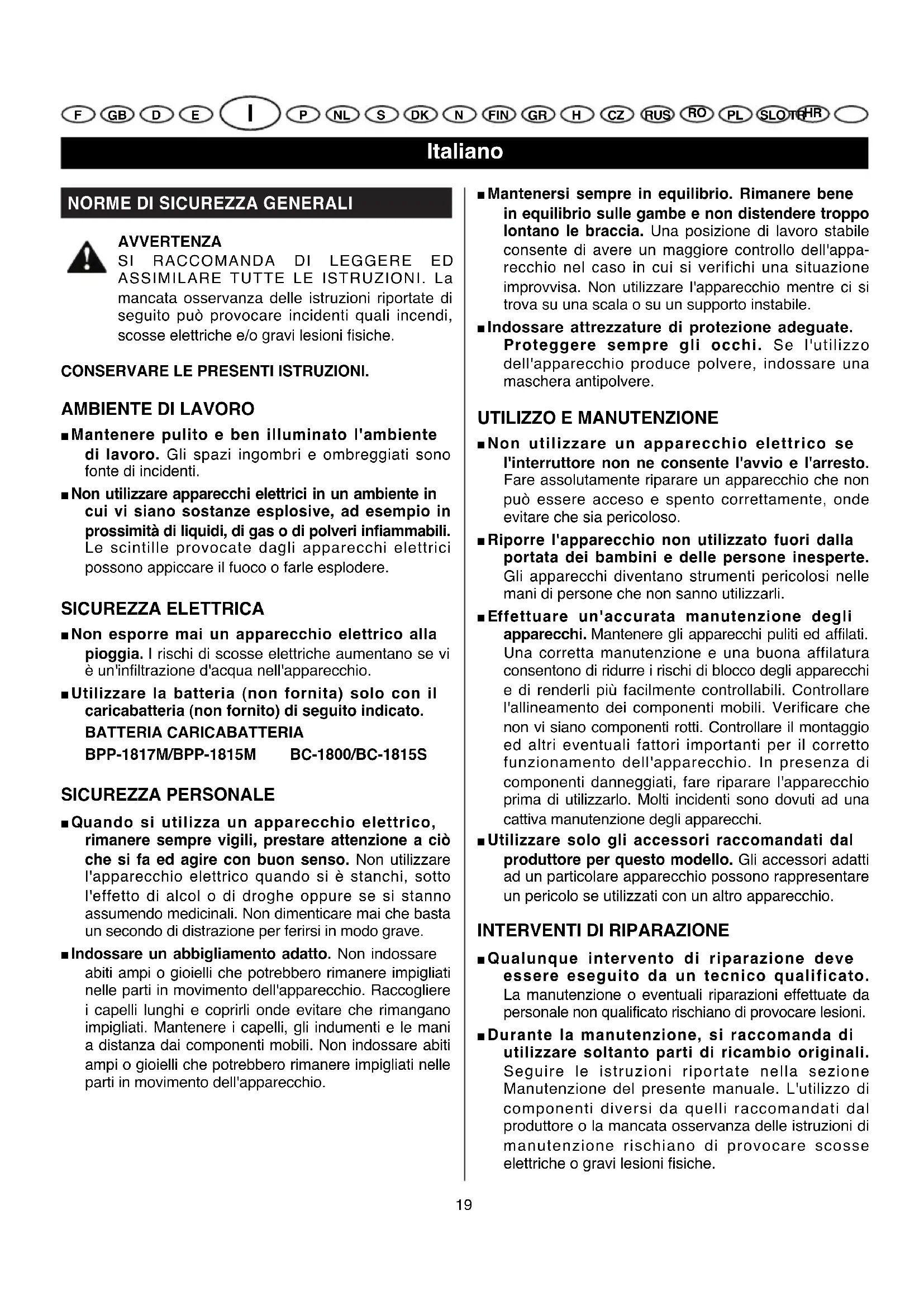 ■ Mantenere pulito e ben illuminato l'ambiente di lavoro. Gli spazi ingombri e ombreggiati sono fonte di incidenti. ■ Non utilizzare apparecchi elettrici in un ambiente in cui vi siano sostanze esplosive, ad esempio in prossimità di liquidi, di gas o di polveri infiammabili. Le scintille provocate dagli apparecchi elettrici possono appiccare il fuoco o farle esplodere. SICUREZZA ELETTRICA ■ Non esporre mai un apparecchio elettrico alla pioggia. I rischi di scosse elettriche aumentano se vi è un'infiltrazione d'acqua nell'apparecchio. ■ Utilizzare la batteria (non fornita) solo con il caricabatteria (non fornito) di seguito indicato. BATTERIA CARICABATTERIA BPP-1817M/BPP-1815M BC-1800/BC-1815S SICUREZZA PERSONALE ■ Quando si utilizza un apparecchio elettrico, rimanere sempre vigili, prestare attenzione a ciò che si fa ed agire con buon senso. Non utilizzare l'apparecchio elettrico quando si è stanchi, sotto l'effetto di alcol o di droghe oppure se si stanno assumendo medicinali. Non dimenticare mai che basta un secondo di distrazione per ferirsi in modo grave. ■ Indossare un abbigliamento adatto. Non indossare abiti ampi o gioielli che potrebbero rimanere impigliati nelle parti in movimento dell'apparecchio. Raccogliere i capelli lunghi e coprirli onde evitare che rimangano impigliati. Mantenere i capelli, gli indumenti e le mani a distanza dai componenti mobili. Non indossare abiti ampi o gioielli che potrebbero rimanere impigliati nelle parti in movimento dell'apparecchio. ■ Mantenersi sempre in equilibrio. Rimanere bene in equilibrio sulle gambe e non distendere troppo lontano le braccia. Una posizione di lavoro stabile consente di avere un maggiore controllo dell'appa- recchio nel caso in cui si verifichi una situazione improvvisa. Non utilizzare l'apparecchio mentre ci si trova su una scala o su un supporto instabile. ■ Indossare attrezzature di protezione adeguate. Proteggere sempre gli occhi. Se l'utilizzo dell'apparecchio produce polvere, indossare una maschera antipolvere.
