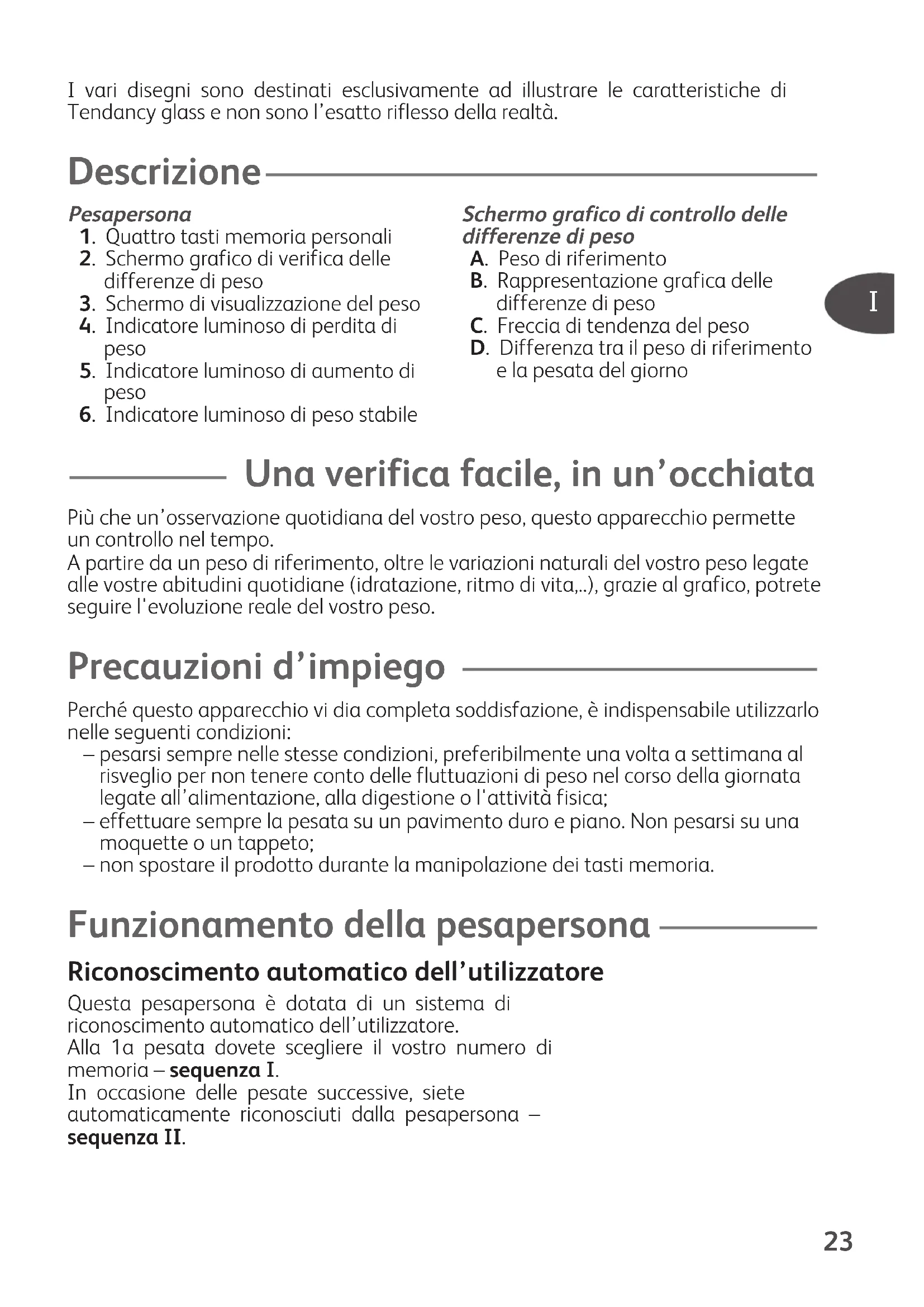 Grafico di verifica delle differenze di peso Allo scopo di seguire in modo più preciso il vostro peso nel tempo, Tendancy glass visualizza lo storico delle vostre differenze di peso su 7 pesate successive. Al primo utilizzo, il vostro peso è registrato come peso di riferimento (punto a – pagina 3). In seguito, a ogni pesata, la vostra differenza di peso tra la pesata del giorno e il peso di riferimento è registrata nel grafico (punto B – pagina 3). La freccia (punto C – pagina 3), vi indica la tendenza di variazione del vostro peso: – freccia verso l’alto, avete preso peso rispetto al vostro peso di riferimento A, – freccia verso il basso, avete perso peso rispetto al vostro peso di riferimento A. Il punto D – pagina 3, vi indica, rispetto al vostro peso di riferimento, la vostra variazione in kg. Cancellazione memoria completa