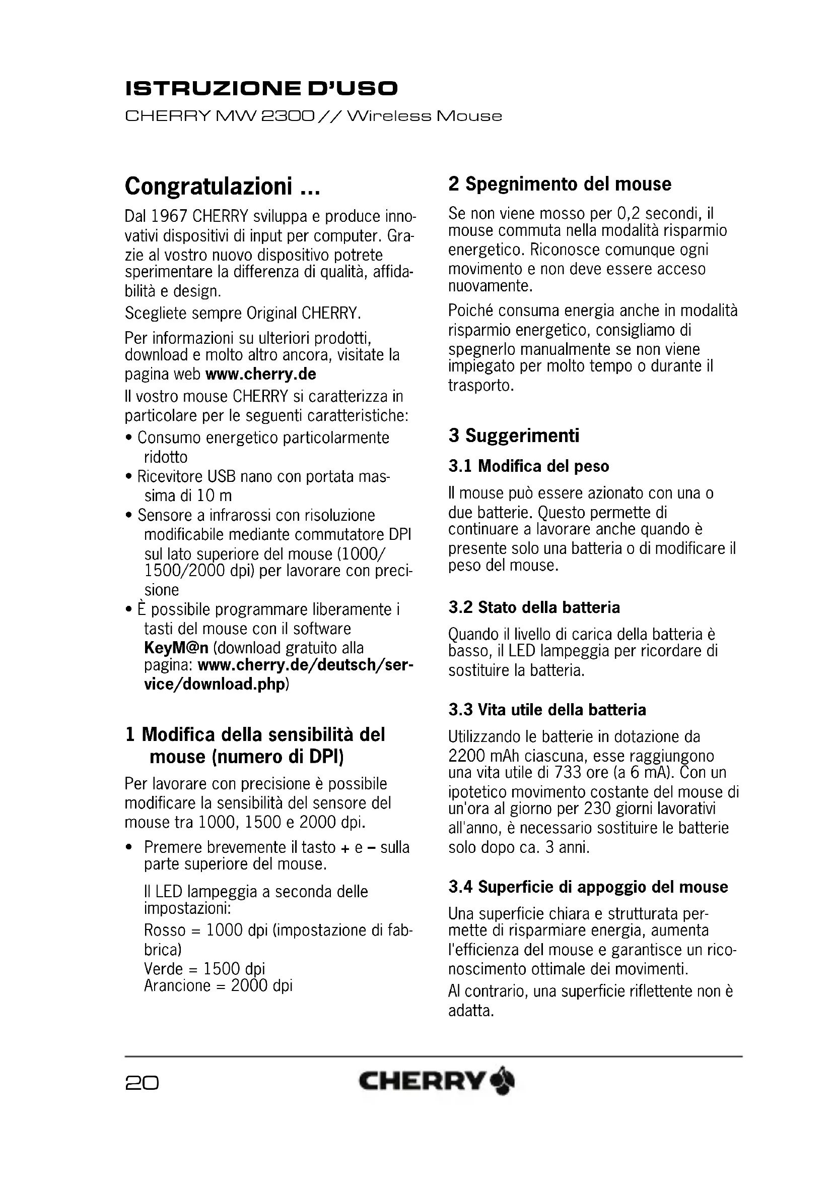 Scarica le istruzioni per il tuo Mouse in formato PDF gratuitamente! Trova il tuo manuale MW 2300 - Cherry e riprendi in mano il tuo dispositivo elettronico. In questa pagina sono pubblicati tutti i documenti necessari per l'utilizzo del tuo dispositivo. MW 2300 del marchio Cherry.