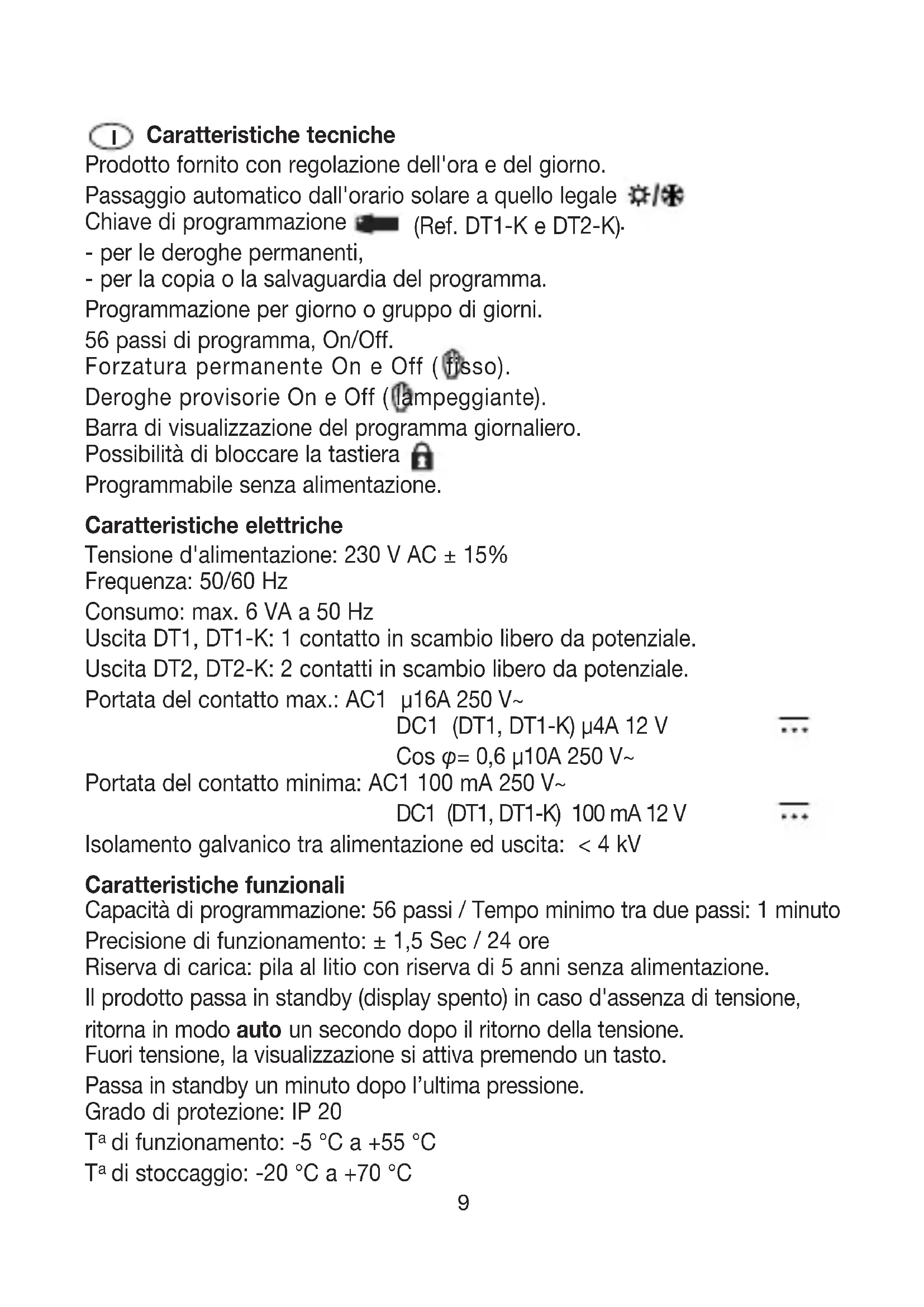 - per le deroghe permanenti, - per la copia o la salvaguardia del programma. Programmazione per giorno o gruppo di giorni. 56 passi di programma, On/Off. Forzatura permanente On e Off ( fisso). Deroghe provisorie On e Off ( lampeggiante). Barra di visualizzazione del programma giornaliero. Possibilità di bloccare la tastiera . Programmabile senza alimentazione. Caratteristiche elettriche Tensione d'alimentazione: 230 V AC ± 15% Frequenza: 50/60 Hz Consumo: max. 6 VA a 50 Hz Uscita DT1, DT1-K: 1 contatto in scambio libero da potenziale. Uscita DT2, DT2-K: 2 contatti in scambio libero da potenziale. Portata del contatto max.: AC1 µ16A 250 V~ DC1 (DT1, DT1-K) µ4A 12 V Cos φ = 0,6 µ10A 250 V~ Portata del contatto minima: AC1 100 mA 250 V~ DC1 (DT1, DT1-K) 100 mA 12 V Isolamento galvanico tra alimentazione ed uscita: < 4 kV Caratteristiche funzionali Capacità di programmazione: 56 passi / Tempo minimo tra due passi: 1 minuto Precisione di funzionamento: ± 1,5 Sec / 24 ore Riserva di carica: pila al litio con riserva di 5 anni senza alimentazione. Il prodotto passa in standby (display spento) in caso d'assenza di tensione, ritorna in modo auto un secondo dopo il ritorno della tensione. Fuori tensione, la visualizzazione si attiva premendo un tasto. Passa in standby un minuto dopo l’ultima pressione. Grado di protezione: IP 20