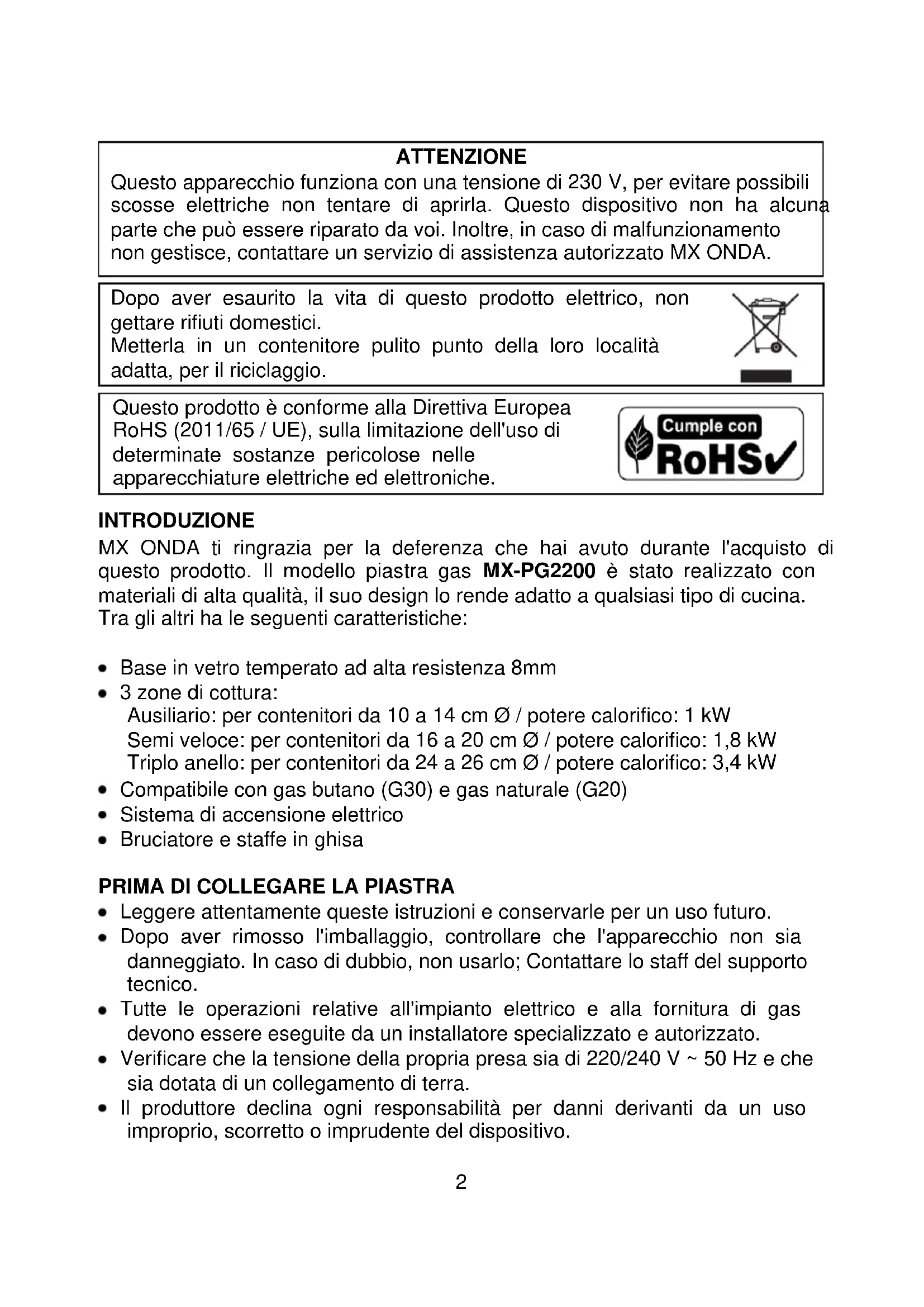 MX ONDA ti ringrazia per la deferenza che hai avuto durante l'acquisto di quello prodotto. Il modello piastra gas MX-PG2200 è stato realizzato con materiali di alta qualità, il suo design lo rende adatto a qualsiasi tipo di cucina. Tra gli altri ha le seguenti caratteristiche: