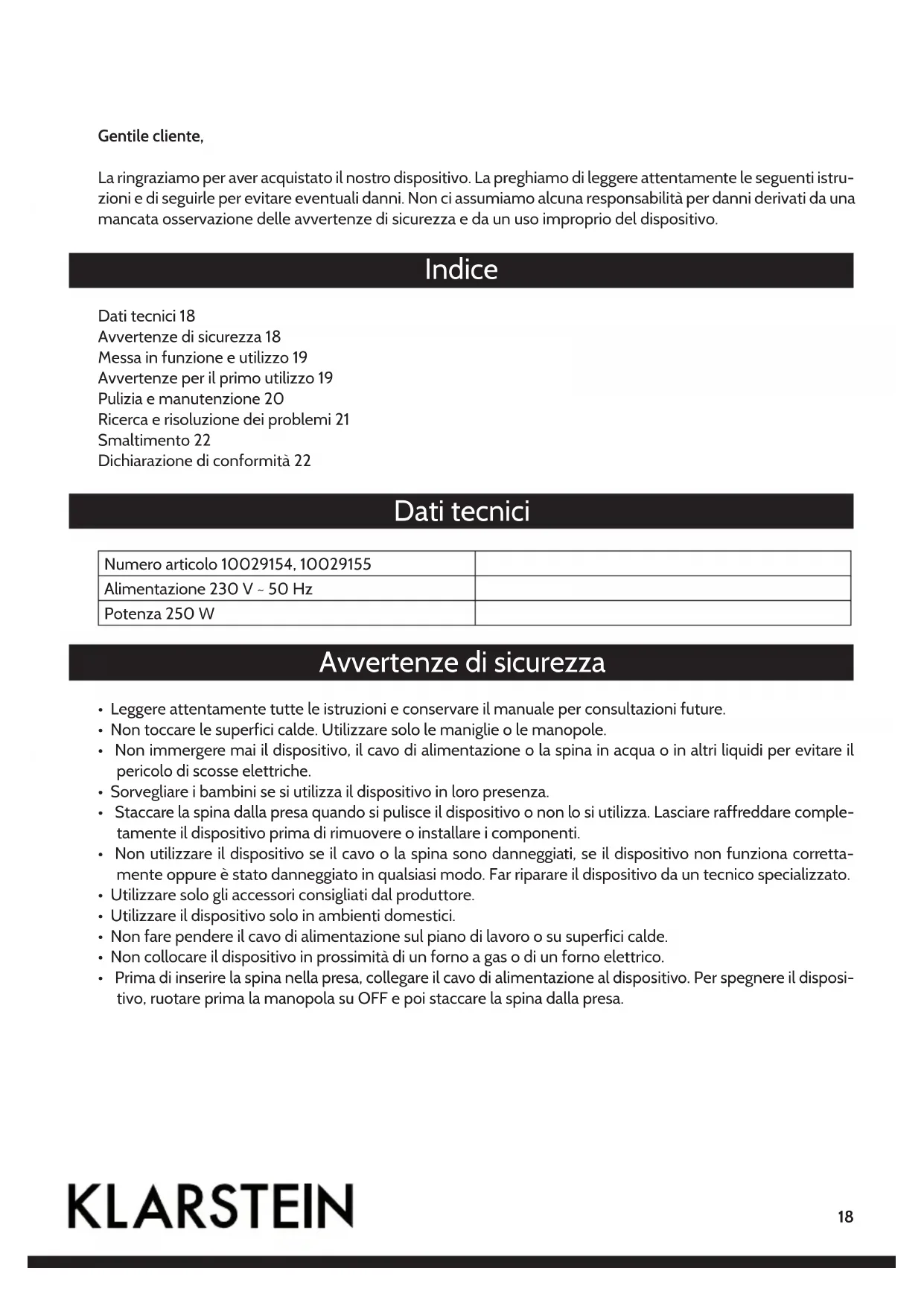 Trova gratuitamente il manuale del dispositivo 10029154 Klarstein in formato PDF.