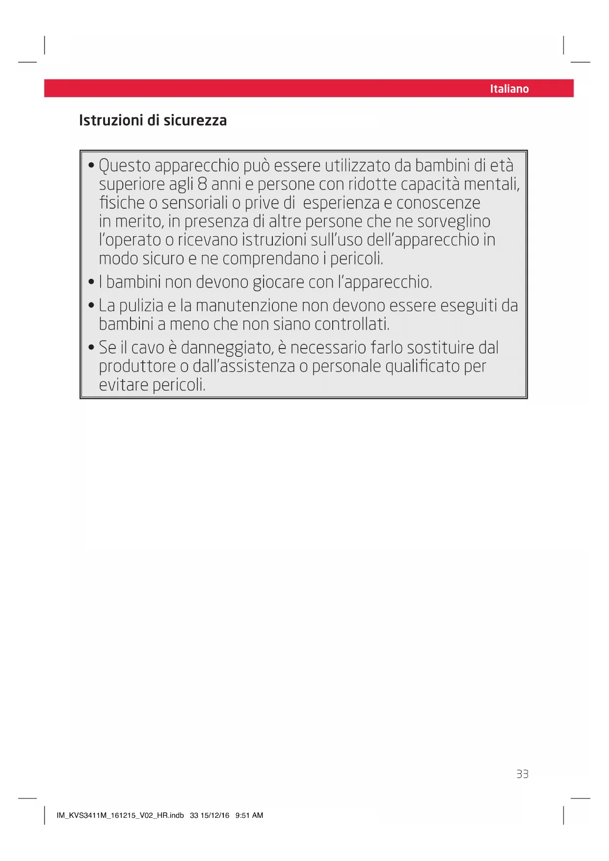 - Questo apparecchio può essere utilizzato da bambini di età superioreagli 8 anni e persone con ridotte capacità mentali, fisiche o sensoriali o prive di esperienza e conoscenze in merito, in presenza di altre persone che ne sorveglino l'operato o ricevano istruzioni sull'uso dell'apparecchio in modo sicuro e ne comprendano i pericoli.