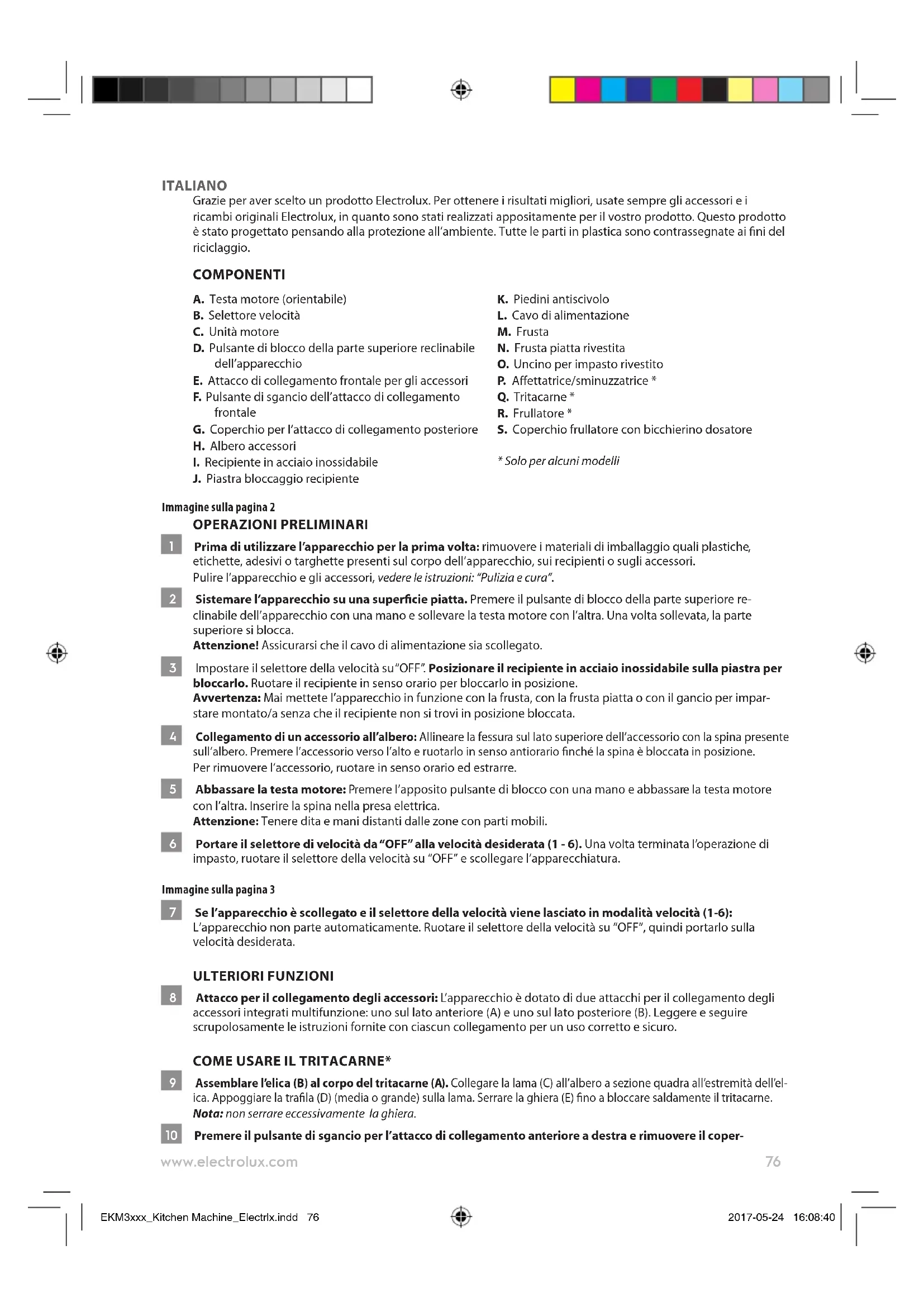 *Ne lépje túl a 2. sebességfokozatot a kelt tészta készítésekor. Ez megrongálhatja a készüléket. EKM3xxx_Kitchen Machine_Electrlx.indd 75 2017-05-24 16:08:4076 www.electrolux.com ITALIANO Grazie per aver scelto un prodotto Electrolux. Per ottenere i risultati migliori, usate sempre gli accessori e i ricambi originali Electrolux, in quanto sono stati realizzati appositamente per il vostro prodotto. Questo prodotto è stato progettato pensando alla protezione all’ambiente. Tutte le parti in plastica sono contrassegnate ai ni del riciclaggio. COMPONENTI A. Testa motore (orientabile) B. Selettore velocità C. Unità motore D. Pulsante di blocco della parte superiore reclinabile dell’apparecchio E. Attacco di collegamento frontale per gli accessori F. Pulsante di sgancio dell’attacco di collegamento frontale G. Coperchio per l’attacco di collegamento posteriore H. Albero accessori