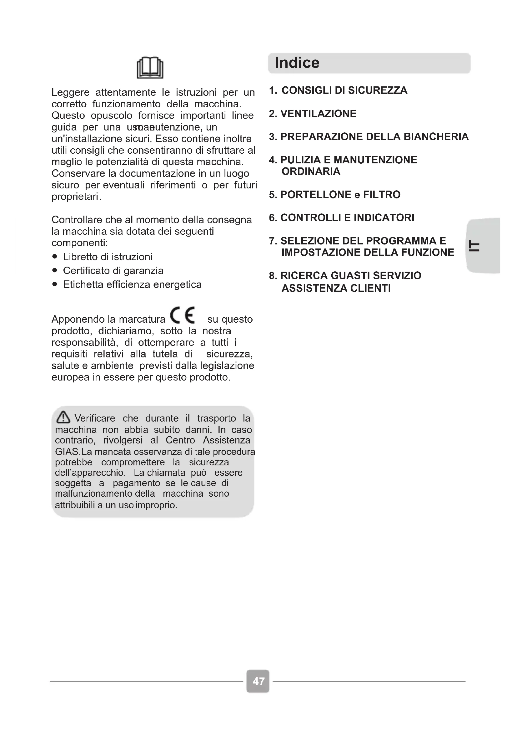 Verificare che durante il trasporto la macchina non abbia subito danni. In caso contrario, rivolgersi al Centro Assistenza GIAS. La mancata osservanza di tale procedura potrebbe promiettere la sicurezza dell'apparecchio. La chiamata cui assere soggetta a pagamento se le cause di malfunzionamento della macchina sono attribuibili a un uso improprio.