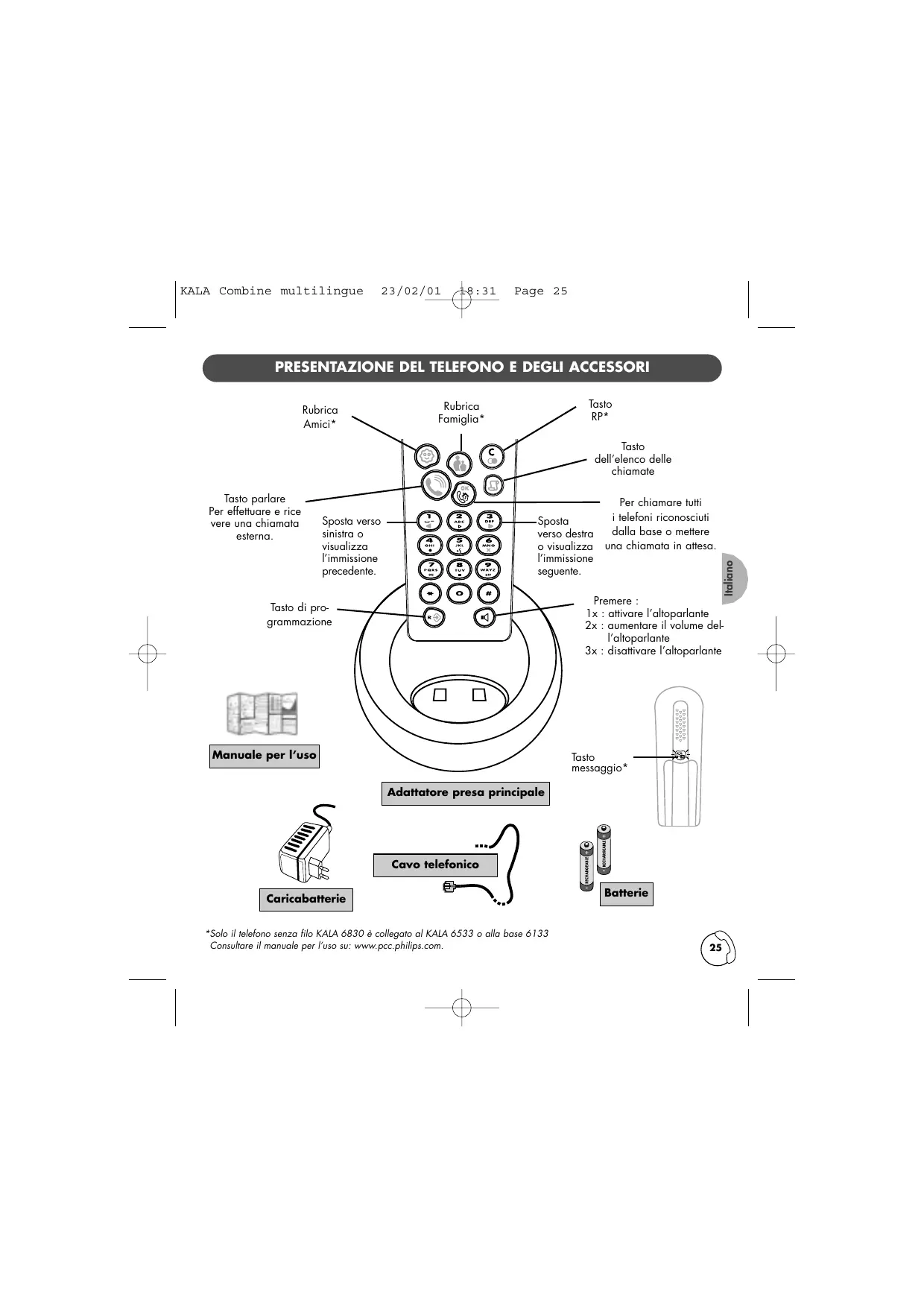 ** Per poter utiliserà la segreteria Telefonica, il Telefono KALA 6830 deve essere collegato alla base KALA 6533. Per gli altri accessori, consultrare i manuale per l'uso della base.