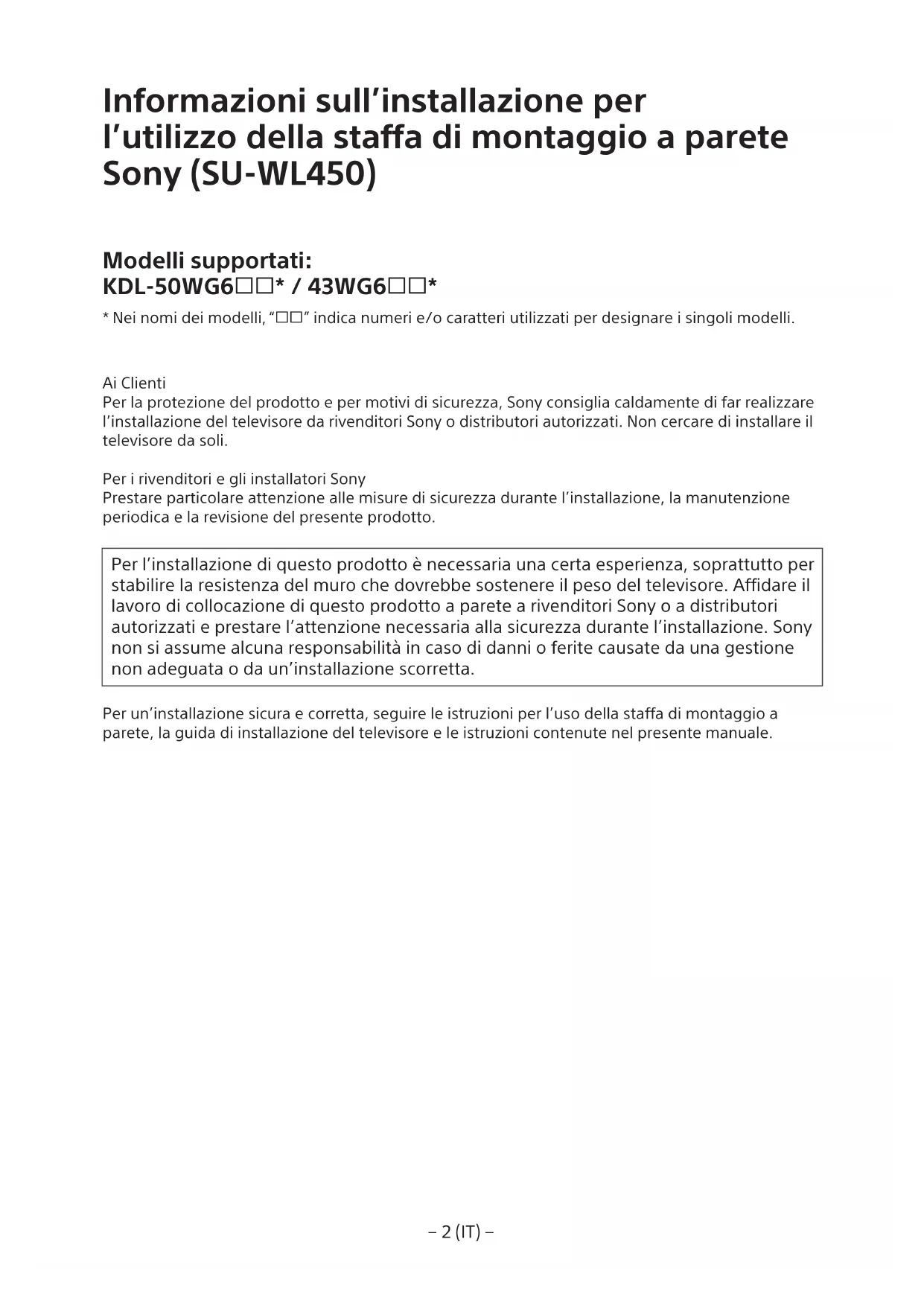 - Nei nomi dei modelli, “” indica numeri e/o caratteri utilizzati per designare i singoli modelli. Ai Clienti Per la protezione del prodotto e per motivi di sicurezza, Sony consiglia caldamente di far realizzare l’installazione del televisore da rivenditori Sony o distributori autorizzati. Non cercare di installare il televisore da soli. Per i rivenditori e gli installatori Sony Prestare particolare attenzione alle misure di sicurezza durante l’installazione, la manutenzione periodica e la revisione del presente prodotto. Per l’installazione di questo prodotto è necessaria una certa esperienza, soprattutto per stabilire la resistenza del muro che dovrebbe sostenere il peso del televisore. Affidare il lavoro di collocazione di questo prodotto a parete a rivenditori Sony o a distributori autorizzati e prestare l’attenzione necessaria alla sicurezza durante l’installazione. Sony non si assume alcuna responsabilità in caso di danni o ferite causate da una gestione non adeguata o da un’installazione scorretta. Per un’installazione sicura e corretta, seguire le istruzioni per l’uso della staffa di montaggio a parete, la guida di installazione del televisore e le istruzioni contenute nel presente manuale.− 3 (IT) − Informazioni sulla sicurezza Grazie per aver acquistato questo prodotto. Informazioni per i clienti Per l’installazione di questo prodotto è necessario disporre di sufficiente competenza. Assicurarsi che l’installazione venga eseguita da rivenditori Sony o da personale autorizzato e prestare particolare attenzione alla sicurezza durante le operazioni di installazione. Sony non potrà essere ritenuta responsabile per danni o lesioni causate da usi non appropriati del prodotto, da installazione non corretta o da installazioni di prodotti diversi da quello specificato. Quanto dichiarato non pregiudica (eventuali) diritti legali dell’acquirente. Informazioni per i rivenditori Sony Per l’installazione di questo prodotto è necessario disporre di sufficiente competenza. Leggere attentamente il presente manuale di istruzioni per garantire la corretta esecuzione della procedura di installazione. Sony non potrà essere ritenuta responsabile per danni o lesioni causate da usi non appropriati del prodotto o da installazione non corretta. Consegnare il presente manuale al cliente dopo l’installazione. Il presente manuale di istruzioni spiega come utilizzare correttamente questo prodotto; inoltre, contiene precauzioni importanti da rispettare per prevenire incidenti. Accertarsi di leggere attentamente questo manuale e di utilizzare correttamente il prodotto. Conservare questo manuale a portata di mano per poterlo consultare in futuro. I prodotti Sony sono progettati per essere sicuri. Ciononostante, è possibile che, se i prodotti vengono utilizzati in modo errato, si verifichino lesioni gravi dovute a incendi, scosse elettriche, ribaltamento o caduta dei prodotti stessi. Onde evitare tali incidenti, accertarsi di osservare le appropriate precauzioni per la sicurezza. ATTENZIONE Prodotti specificati Questa staffa di montaggio a parete è progettata per essere utilizzata con i televisori specificati. Per quanto riguarda i televisori, consultare la relativa Guida di riferimento per verificare se la presente staffa di montaggio a parete può essere utilizzata. Informazioni per i clienti AVVERTENZA Se le precauzioni riportate di seguito non vengono rispettate, è possibile procurarsi lesioni gravi o mortali a causa di incendi, scosse elettriche o caduta del prodotto. Assicurarsi che l’installazione venga eseguita da personale autorizzato e tenere lontani i bambini durante l’installazione. Se la staffa di montaggio a parete o il televisore non vengono installati correttamente, possono verificarsi i seguenti incidenti. Accertarsi che l’installazione sia effettuata da personale autorizzato.