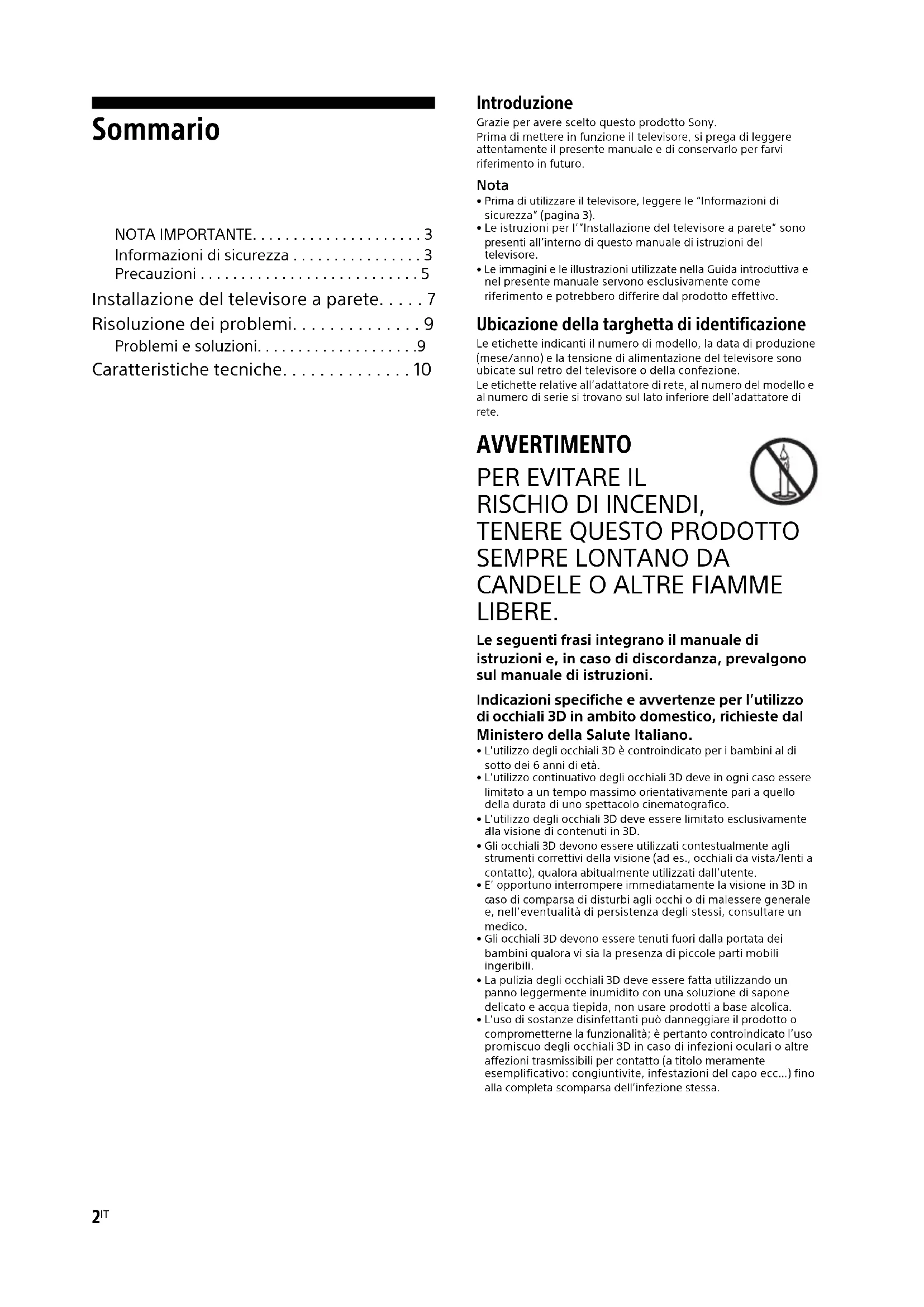 - Caratteristiche tecniche Introduzione Grazie per avere scelto questo prodotto Sony. Prima di mettere in funzione il televisore, si prega di leggere attentamente il presente manuale e di conservarlo per farvi riferimento in futuro. Nota p. 10