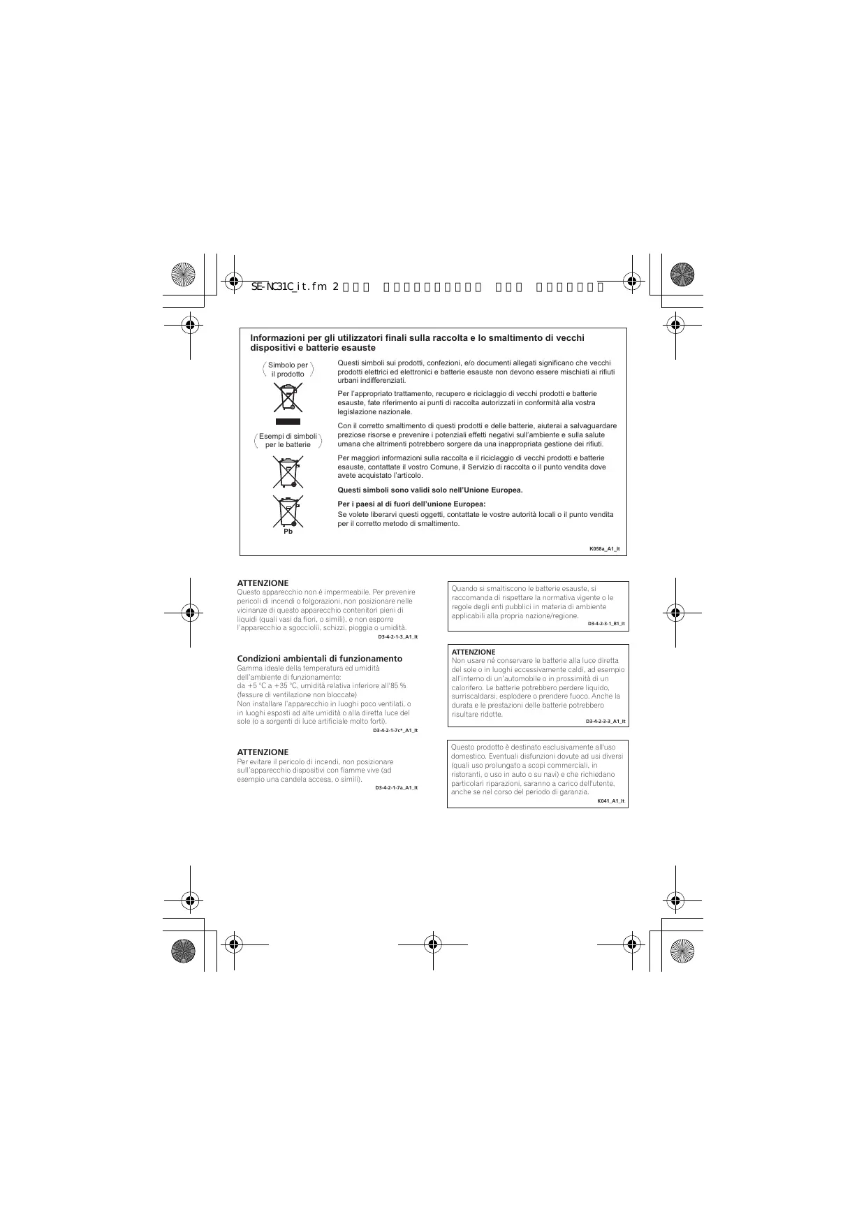 ATTENZIONE Non usare né conservare le batterie alla luce diretta del sole o in luoghi eccessivamente caldi, ad esempio all’interno di un’automobile o in prossimità di un calorifero. Le batterie potrebbero perdere liquido, surriscaldarsi, esplodere o prendere fuoco. Anche la durata e le prestazioni delle batterie potrebbero risultare ridotte. D3-4-2-3-3_A1_It
