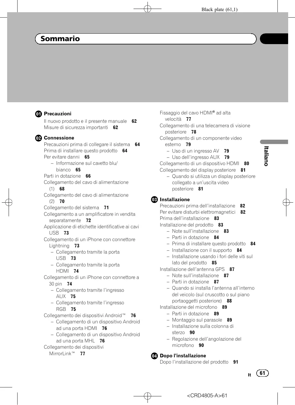 <CRD4805-A>60 Black plate (61,1) Sommario Precauzioni Il nuovo prodotto e il presente manuale 62 Misure di sicurezza importanti 62 Italiano Connessione Precauzioni prima di collegare il sistema 64 Prima di installare questo prodotto 64 Per evitare danni 65 – Informazione sul cavetto blu/ bianco 65 Parti in dotazione 66 Collegamento del cavo di alimentazione (1) 68 Collegamento del cavo di alimentazione (2) 70 Collegamento del sistema 71 Collegamento a un amplificatore in vendita separatamente 72 Applicazione di etichette identificative ai cavi USB 73 Collegamento di un iPhone con connettore Lightning 73 – Collegamento tramite la porta USB 73 – Collegamento tramite la porta HDMI 74 Collegamento di un iPhone con connettore a 30 pin 74 – Collegamento tramite l’ingresso AUX 75 – Collegamento tramite l’ingresso RGB 75 Collegamento dei dispositivi Android™ 76 – Collegamento di un dispositivo Android ad una porta HDMI 76 – Collegamento di un dispositivo Android ad una porta MHL 76 Collegamento dei dispositivi MirrorLink™ 77 Fissaggio del cavo HDMI® ad alta velocità 77 Collegamento di una telecamera di visione posteriore 78 Collegamento di un componente video esterno 79 – Uso di un ingresso AV 79 – Uso dell’ingresso AUX 79 Collegamento di un dispositivo HDMI 80 Collegamento del display posteriore 81 – Quando si utilizza un display posteriore collegato a un’uscita video posteriore 81 Installazione Precauzioni prima dell’installazione 82 Per evitare disturbi elettromagnetici 82 Prima dell’installazione 83 Installazione del prodotto 83 – Note sull’installazione 83 – Parti in dotazione 84 – Prima di installare questo prodotto 84 – Installazione con il supporto 84 – Installazione usando i fori delle viti sul lato del prodotto 85 Installazione dell’antenna GPS 87 – Note sull’installazione 87 – Parti in dotazione 87 – Quando si installa l’antenna all’interno del veicolo (sul cruscotto o sul piano portaoggetti posteriore) 88 Installazione del microfono 89 – Parti in dotazione 89 – Montaggio sul parasole 89 – Installazione sulla colonna di sterzo 90 – Regolazione dell’angolazione del microfono 90 Dopo l’installazione Dopo l’installazione del prodotto 91