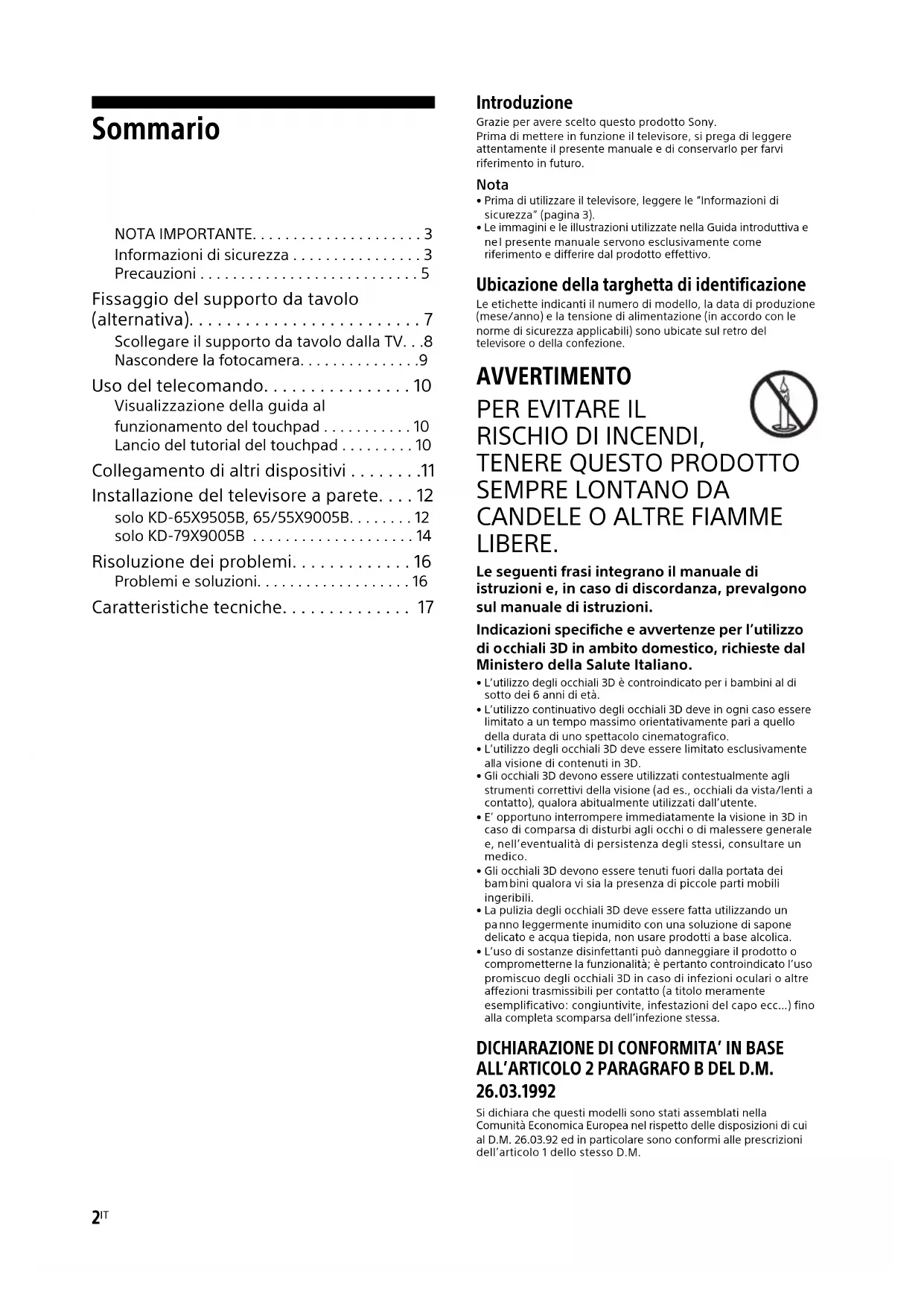 - Caratteristiche tecniche Introduzione Grazie per avere scelto questo prodotto Sony. Prima di mettere in funzione il televisore, si prega di leggere attentamente il presente manuale e di conservarlo per farvi riferimento in futuro. Nota p. 17