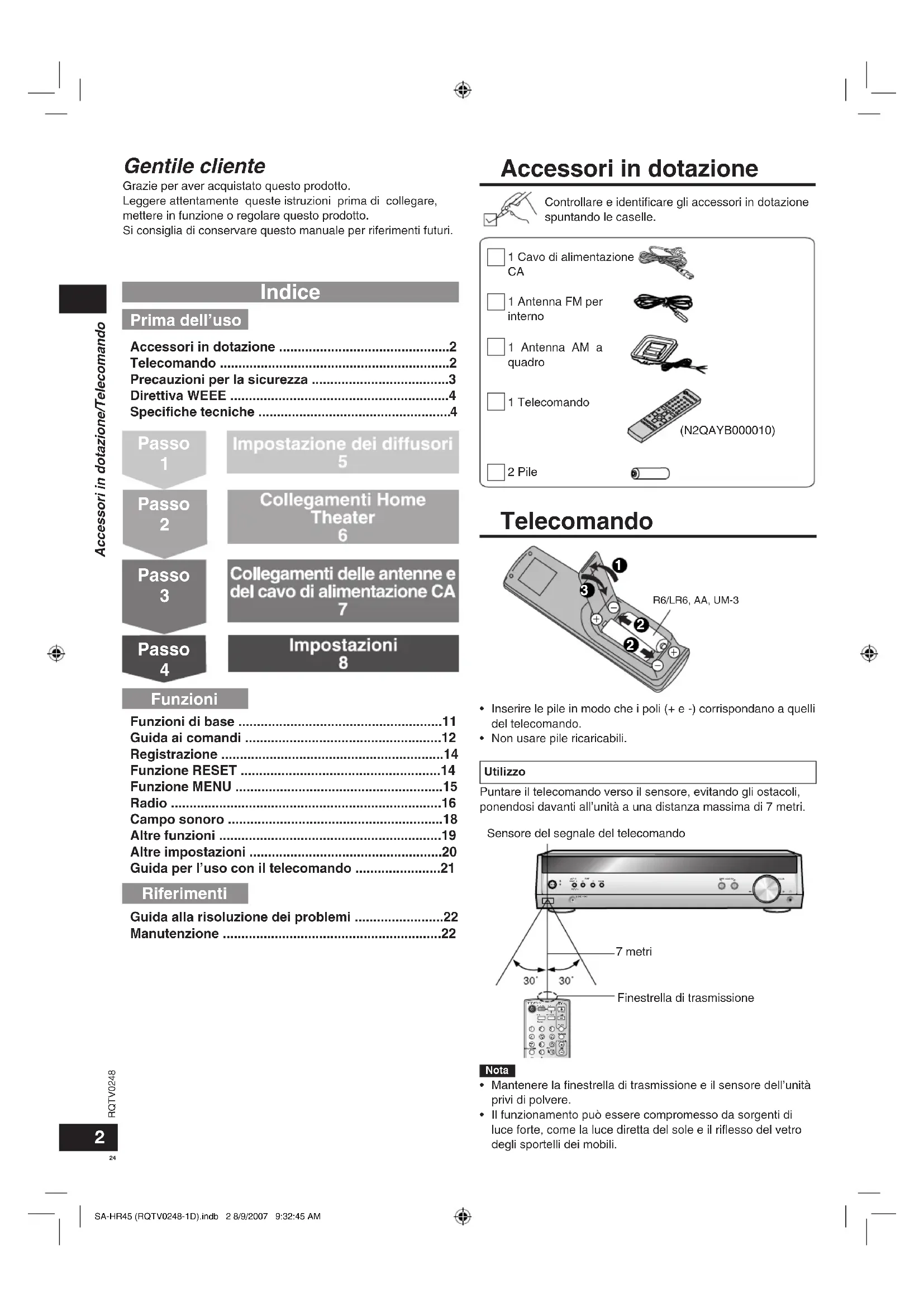 Nota SA-HR45 (RQTV0248-1D).indb 2 8/9/2007 9:32:45 AM3 RQTV0248 ITALIANO Precauzioni per la sicurezza Precauzioni per la sicurezza Sistemazione Sistemare l’unità su una superficie piana, dove non ci sono la luce diretta del sole, alte temperature, alta umidità e vibrazioni eccessive. Queste condizioni possono danneggiare il mobile e altri componenti, riducendo così la vita di servizio dell’unità.Non mettere oggetti pesanti sull’unità. Tensione Non usare fonti di alimentazione ad alta tensione. Ciò potrebbe sovraccaricare l’unità e causare un incendio.Non usare una fonte di alimentazione in c.c. Controllare con cura la fonte di alimentazione se si usa l’unità su una nave od altro luogo dove viene usata la corrente continua. Protezione del cavo di alimentazione c.a. Accertarsi che il cavo di alimentazione c.a. sia collegato correttamente e che non sia danneggiato. Se il cavo di alimentazione non è collegato correttamente ed è danneggiato, può causare un incendio o scosse elettriche. Non tirare, piegare o mettere oggetti pesanti sul cavo.Per staccare il cavo, prenderlo saldamente per la spina. Se si tira il cavo di alimentazione c.a., c’è pericolo di scosse elettriche.Non maneggiare la spina con le mani bagnate. C’è pericolo di scosse elettriche. Oggetti estranei Fare attenzione che non cadano oggetti metallici all’interno dell’unità. C’è pericolo di scosse elettriche o di un malfunzionamento.Fare attenzione che non cadano liquidi all’interno dell’unità. C’è pericolo di scosse elettriche o di un malfunzionamento. Se ciò dovesse accadere, staccare immediatamente il cavo di alimentazione dalla presa di corrente e rivolgersi al rivenditore.Non spruzzare insetticidi sopra o dentro l’unità. Essi contengono gas infiammabili che potrebbero prendere fuoco se spruzzati dentro l’unità. Riparazioni Non cercare di riparare l’unità da soli. Se il suono si interrompe, gli indicatori non si accendono, esce del fumo o si verifica un qualsiasi altro problema non contemplato in queste istruzioni per l’uso, staccare il cavo di alimentazione e rivolgersi al rivenditore o a un centro di assistenza autorizzato. C’è pericolo di scosse elettriche o di danni all’unità se viene riparata, smontata o rimontata da personale non qualificato.Estendere la durata dell’unità staccando il cavo di alimentazione dalla presa di corrente se non si intende usarla per un lungo periodo di tempo. ATTENZIONE!