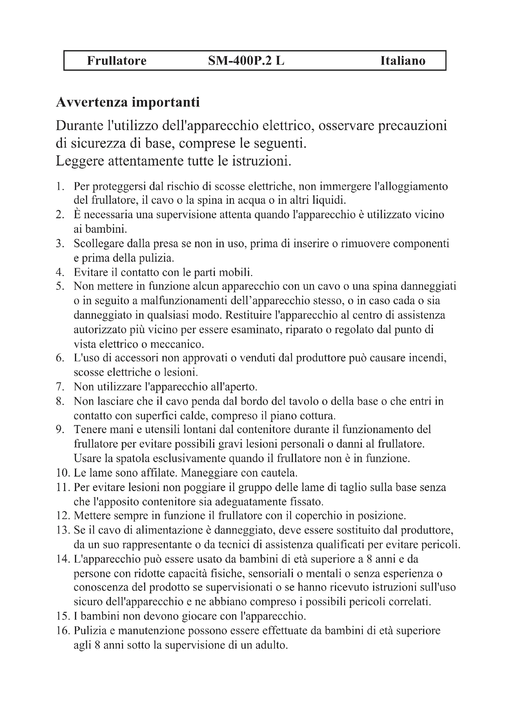 APPAREIL RESPECTUEUX DE L’ENVIRONNEMENTFrullatore SM-400P.2 L Italiano Avvertenza importanti Durante l'utilizzo dell'apparecchio elettrico, osservare precauzioni di sicurezza di base, comprese le seguenti. Leggere attentamente tutte le istruzioni.