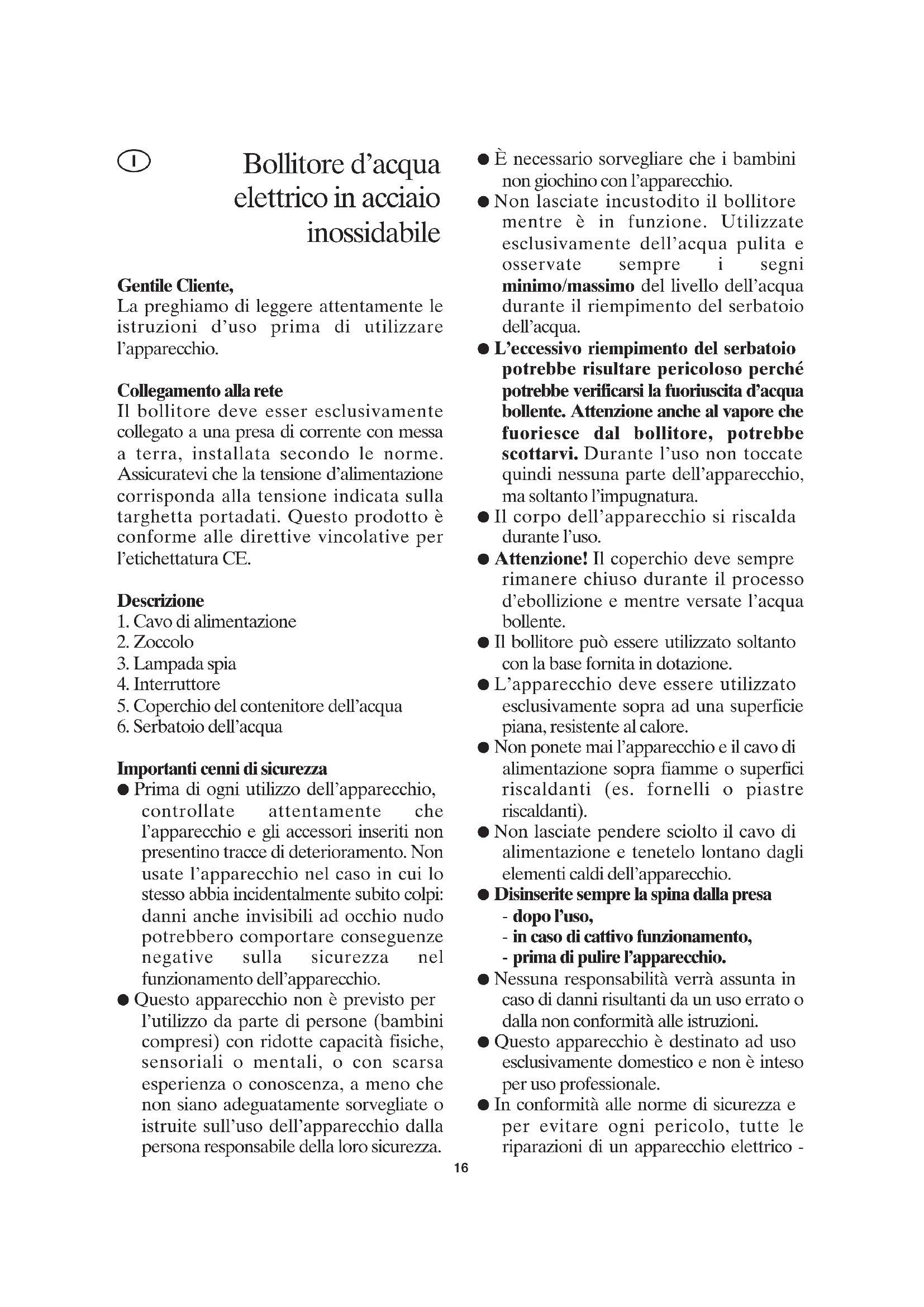 Non lasciate incustodito il bollitore perché è in funzione. Utilizzate esclusivamente dell'acqua pulita e osservate sempre i segni minimo/massimo del livello dell'acqua durante il riempimento del serbatoio dell'acqua. - L'ecessivo riempimento del serbatoio potrebbe risultare pericoloso perché potrebbe verificarsi la fuoriuscita d'acqua bollente. Attenzioneanche al vapore che fuoriesce dal bollitore, potrebbscottarvi.Durante l'uso non toccate quando nessuna parte dell'apparecchio, ma soltanto l'impugnatura.