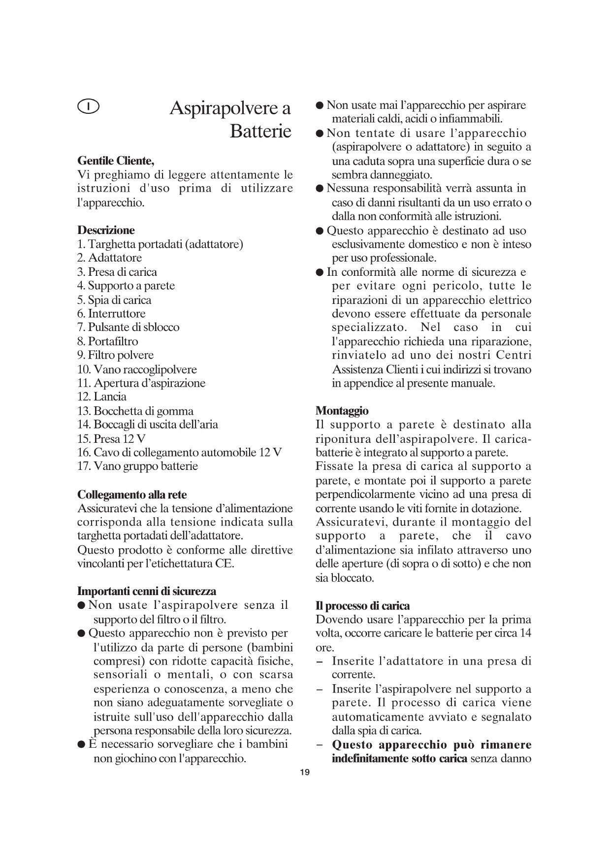 Collegamento alla rete Assicuratevi che la tensione d’alimentazione corrisponda alla tensione indicata sulla targhetta portadati dell’adattatore. Questo prodotto è conforme alle direttive vincolanti per l’etichettatura CE. Importanti cenni di sicurezza ● Non usate l’aspirapolvere senza il supporto del filtro o il filtro. ● Questo apparecchio non è previsto per l'utilizzo da parte di persone (bambini compresi) con ridotte capacità fisiche, sensoriali o mentali, o con scarsa esperienza o conoscenza, a meno che non siano adeguatamente sorvegliate o istruite sull'uso dell'apparecchio dalla persona responsabile della loro sicurezza. ● È necessario sorvegliare che i bambini non giochino con l'apparecchio. ● Non usate mai l’apparecchio per aspirare materiali caldi, acidi o infiammabili. ● Non tentate di usare l’apparecchio (aspirapolvere o adattatore) in seguito a una caduta sopra una superficie dura o se sembra danneggiato. ● Nessuna responsabilità verrà assunta in caso di danni risultanti da un uso errato o dalla non conformità alle istruzioni. ● Questo apparecchio è destinato ad uso esclusivamente domestico e non è inteso per uso professionale. ● In conformità alle norme di sicurezza e per evitare ogni pericolo, tutte le riparazioni di un apparecchio elettrico devono essere effettuate da personale specializzato. Nel caso in cui l'apparecchio richieda una riparazione, rinviatelo ad uno dei nostri Centri Assistenza Clienti i cui indirizzi si trovano in appendice al presente manuale. Montaggio Il supporto a parete è destinato alla riponitura dell’aspirapolvere. Il carica- batterie è integrato al supporto a parete. Fissate la presa di carica al supporto a parete, e montate poi il supporto a parete perpendicolarmente vicino ad una presa di corrente usando le viti fornite in dotazione. Assicuratevi, durante il montaggio del supporto a parete, che il cavo d’alimentazione sia infilato attraverso uno delle aperture (di sopra o di sotto) e che non sia bloccato. Il processo di carica Dovendo usare l’apparecchio per la prima volta, occorre caricare le batterie per circa 14 ore.