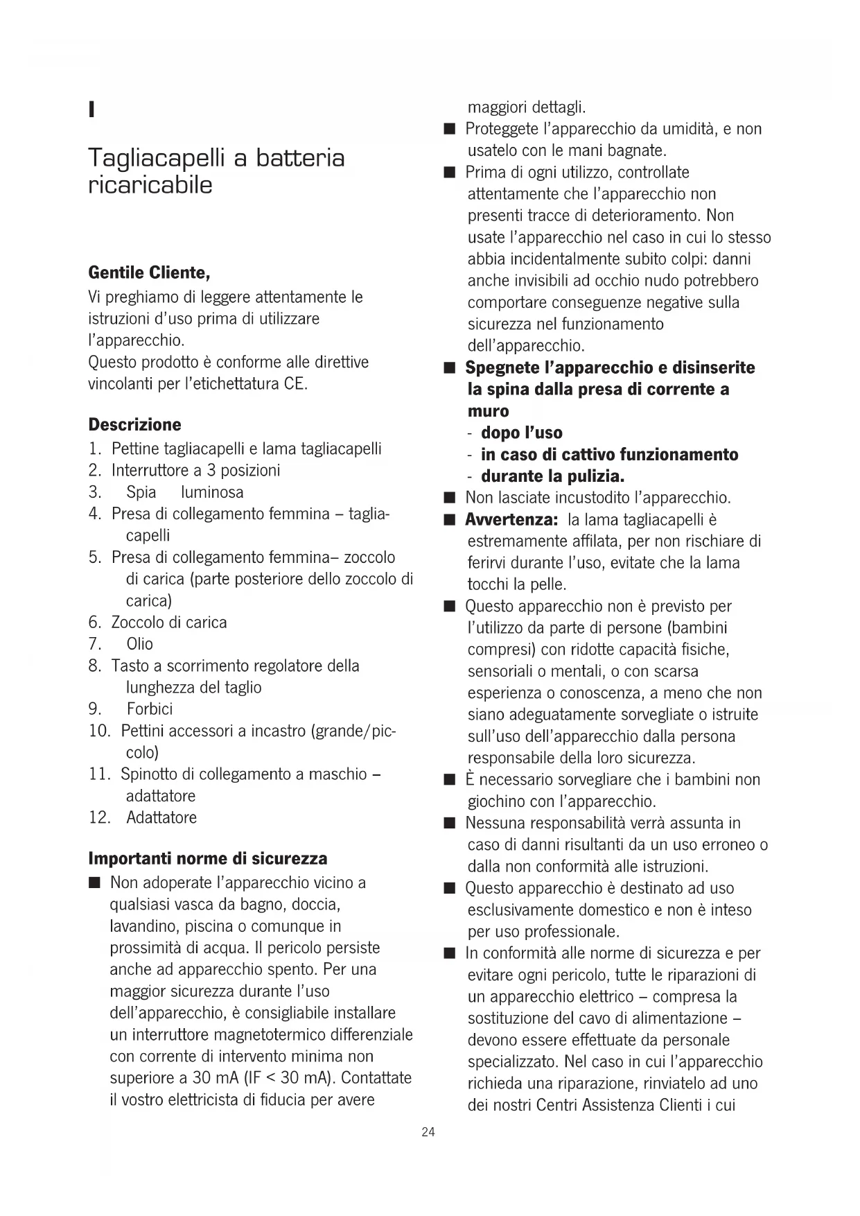 Importanti norme di sicurezza ■ Non adoperate l’apparecchio vicino a qualsiasi vasca da bagno, doccia, lavandino, piscina o comunque in prossimità di acqua. Il pericolo persiste anche ad apparecchio spento. Per una maggior sicurezza durante l’uso dell’apparecchio, è consigliabile installare un interruttore magnetotermico differenziale con corrente di intervento minima non superiore a 30 mA (IF < 30 mA). Contattate il vostro elettricista di fiducia per avere maggiori dettagli. ■ Proteggete l’apparecchio da umidità, e non usatelo con le mani bagnate. ■ Prima di ogni utilizzo, controllate attentamente che l’apparecchio non presenti tracce di deterioramento. Non usate l’apparecchio nel caso in cui lo stesso abbia incidentalmente subito colpi: danni anche invisibili ad occhio nudo potrebbero comportare conseguenze negative sulla sicurezza nel funzionamento dell’apparecchio. ■ Spegnete l’apparecchio e disinserite la spina dalla presa di corrente a muro - dopo l’uso - in caso di cattivo funzionamento - durante la pulizia. ■ Non lasciate incustodito l’apparecchio. ■ Avvertenza: la lama tagliacapelli è estremamente affilata, per non rischiare di ferirvi durante l’uso, evitate che la lama tocchi la pelle. ■ Questo apparecchio non è previsto per l’utilizzo da parte di persone (bambini compresi) con ridotte capacità fisiche, sensoriali o mentali, o con scarsa esperienza o conoscenza, a meno che non siano adeguatamente sorvegliate o istruite sull’uso dell’apparecchio dalla persona responsabile della loro sicurezza. ■ È necessario sorvegliare che i bambini non giochino con l’apparecchio. ■ Nessuna responsabilità verrà assunta in caso di danni risultanti da un uso erroneo o dalla non conformità alle istruzioni. ■ Questo apparecchio è destinato ad uso esclusivamente domestico e non è inteso per uso professionale. ■ In conformità alle norme di sicurezza e per evitare ogni pericolo, tutte le riparazioni di un apparecchio elettrico – compresa la sostituzione del cavo di alimentazione – devono essere effettuate da personale specializzato. Nel caso in cui l’apparecchio richieda una riparazione, rinviatelo ad uno dei nostri Centri Assistenza Clienti i cui 24indirizzi si trovano in appendice al presente manuale. Collegamento alla rete Assicuratevi che la tensione d’alimentazione corrisponda alla tensione indicata sulla targhetta portadati dell’adattatore. Il processo di carica Per il primo utilizzo del tagliacapelli, occorre mettere in carica la batteria per circa 10 ore. Ma un periodo più lungo di carica non comporta nessun danno o pericolo per l’apparecchio. Se notate una notevole diminuzione della capacità di taglio o se vedete il lampeggio rosso della spia luminosa, spegnete l’apparecchio e mettete in ricarica la batteria. L’apparecchio comunque può funzionare anche se viene collegato direttamente alla rete per mezzo dell’adattatore. In questo caso, però, la batteria deve essere messa in carica per un breve periodo di circa 10 minuti. Il processo di carica ha inizio ad apparecchio spento ed è segnalato dall’apposita spia luminosa.