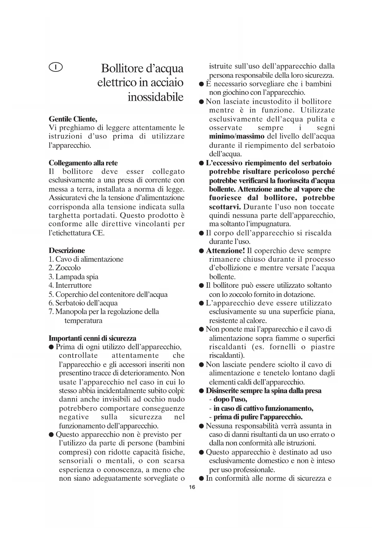 Il dispositivo di interruzione automatica preregolata protegge l'elemento riscaldante contro il surriscaldamento nel caso in cui l'apparecchio venga accesso perché ci si acqua all'interno o se l'elemento riscaldante presenta grosse incrostazioni di calcare. Se l'apparecchio viene spento dal dispositivo di interruzione termica, prima di essere riaccesso dovra raffreddarsi Completely e essere disincrostato dai depositi dicalcare.