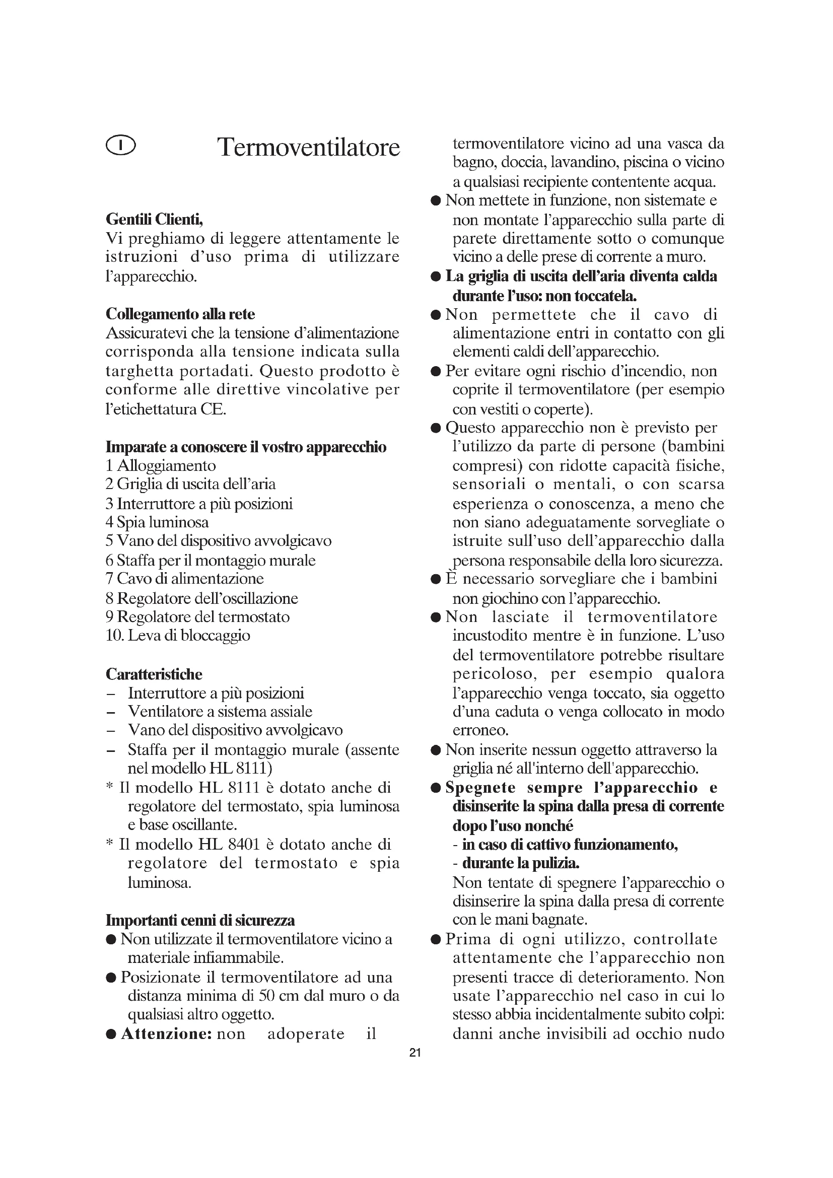 - Il modello HL 8111 è dotatoanche di regolatore del termostato, spia luminosa e base oscillante.