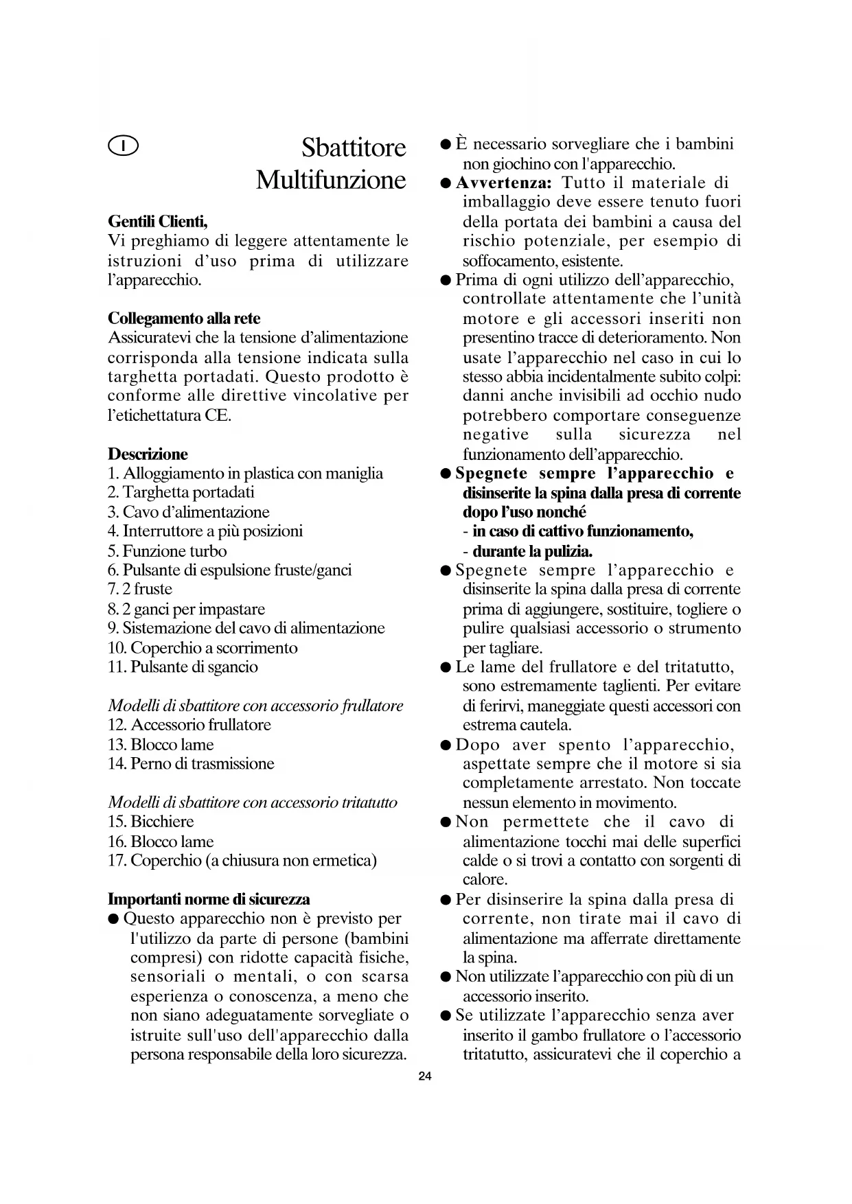 - Prima di ogni utilizzato dell'apparecchio, controllate attendamente che l'unità motore e gli accessori inserti non presentino trace di deterioramento. Non usate l'apparecchio nel caso in cui lo stesso abbia incidentalmente subito colpi: dannianche invisibili ad occhio nudo potrebbero comportare consequences negative sulla sicurezza nel funzionamento dell'apparecchio.