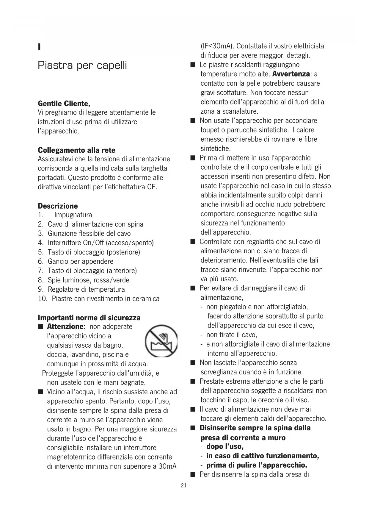 ■ Vicino all'acqua, il rischio sussisteanche ad apparecchio spento. Pertanto, dopo I'uso, disinserite sempre la spina alla presa di corrente a muro se I'apparecchio viene usato in bagno.Per una maggiore sicurezza durante I'uso dell'apparecchio è consigliabile installare un interrottore magnetotermico differenziale con corrente di intervento minima non superiore a 30mA