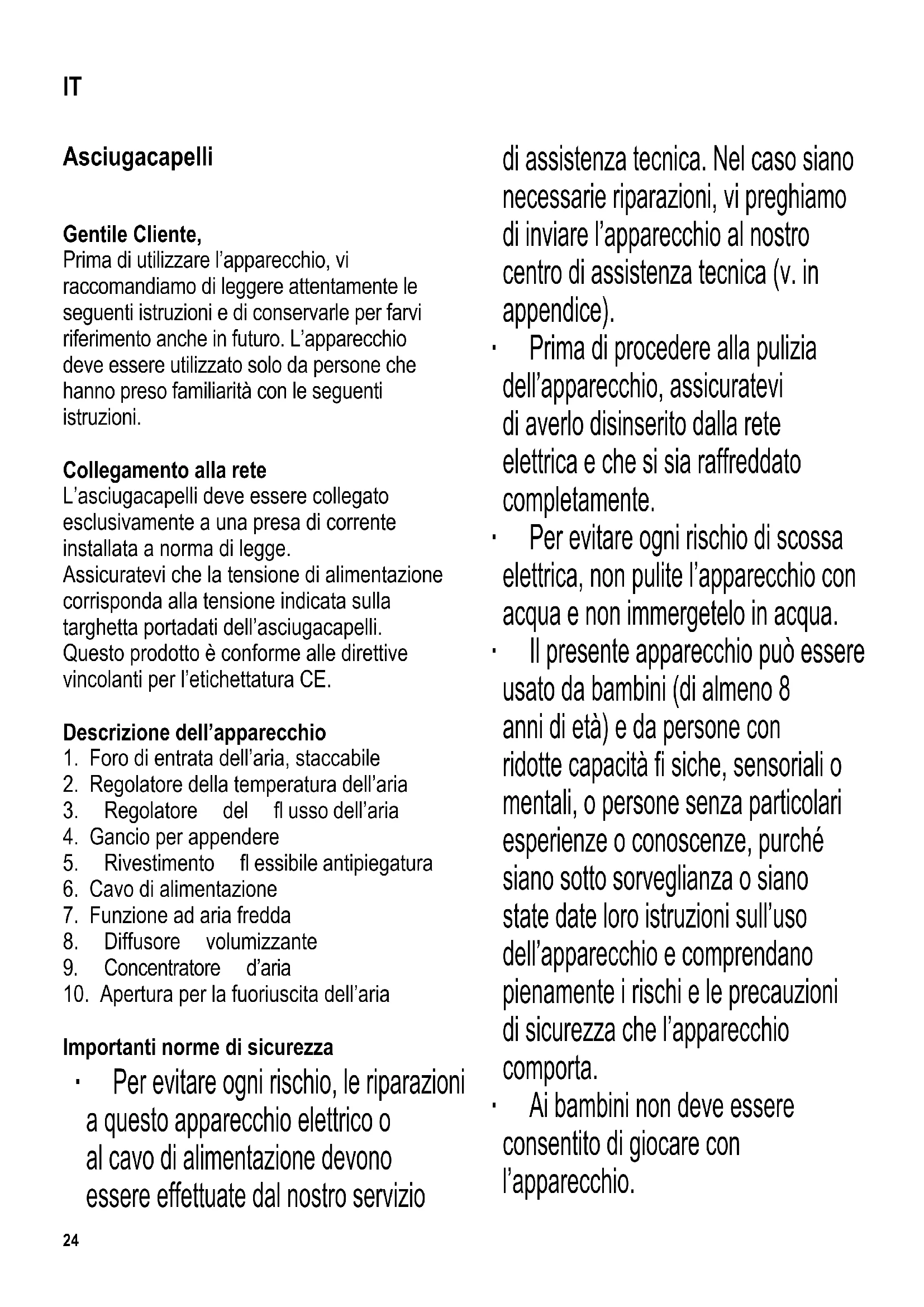 Importanti norme di sicurezza ∙ Per evitare ogni rischio, le riparazioni a questo apparecchio elettrico o al cavo di alimentazione devono essere effettuate dal nostro servizio di assistenza tecnica. Nel caso siano necessarie riparazioni, vi preghiamo di inviare l’apparecchio al nostro centro di assistenza tecnica (v. in appendice). ∙ Prima di procedere alla pulizia dell’apparecchio, assicuratevi di averlo disinserito dalla rete elettrica e che si sia raffreddato completamente. ∙ Per evitare ogni rischio di scossa elettrica, non pulite l’apparecchio con acqua e non immergetelo in acqua. ∙ Il presente apparecchio può essere usato da bambini (di almeno 8 anni di età) e da persone con ridotte capacità fi siche, sensoriali o mentali, o persone senza particolari esperienze o conoscenze, purché siano sotto sorveglianza o siano state date loro istruzioni sull’uso dell’apparecchio e comprendano pienamente i rischi e le precauzioni di sicurezza che l’apparecchio comporta. ∙ Ai bambini non deve essere consentito di giocare con l’apparecchio. IT25 ∙ Ai bambini non deve essere consentito di effettuare operazioni di pulizia o di manutenzione sull’apparecchio senza essere sorvegliati. ∙ Attenzione: non utilizzate l’apparecchio vicino a vasche da bagno, lavabi o altri contenitori di acqua. ∙ Vicino all’acqua, il rischio sussiste anche ad apparecchio spento. Pertanto, dopo l’uso, disinserite sempre la spina dalla presa di corrente a muro se l’apparecchio viene usato in bagno. ∙ Per una maggiore sicurezza durante l’uso dell’apparecchio è consigliabile installare un interruttore magnetotermico differenziale con corrente di intervento minima non superiore a 30mA (IF<30mA). Contattate il vostro elettricista di fi ducia per avere maggiori dettagli. ∙ Avvertenza: Tutto il materiale di imballaggio deve essere tenuto fuori della portata dei bambini a causa del rischio potenziale esistente, per esempio di soffocamento. ∙ Proteggete l’apparecchio dall’umidità, e non usatelo con le mani bagnate. ∙ Gli apparecchi elettrodomestici per riscaldamento funzionano a temperature altissime. Non toccate nessuna parte dell’apparecchio tranne l’impugnatura. Il contatto con gli elementi caldi potrebbe causare delle bruciature. Mentre usate l’asciugacapelli, tenetelo esclusivamente dall’impugnatura. ∙ Non usate l’apparecchio per arricciare toupet o parrucche sintetiche. Il calore emesso rischierebbe di rovinare le fi bre sintetiche. ∙ Badate a non ostruire con le dita i fori di entrata e di uscita dell’aria e non permettete l’accumulo di fi bre dentro il foro di entrata dell’aria. ∙ Un blocco nel sistema del fl usso dell’aria, può fare in modo che l’interruttore termico integrato di sicurezza arresti il funzionamento dell’apparecchio. In questo caso, disinserite immediatamente l’apparecchio dalla rete di alimentazione e lasciatelo raffreddare per un suffi ciente lasso di tempo prima di rimuovere il blocco e di riaccendere l’apparecchio. ∙ Prima di ogni utilizzo dell’apparecchio, controllate attentamente che l’apparecchio e gli accessori inseriti non presentino tracce di deterioramento. Se per esempio fosse caduto battendo su una superfi cie dura, o se è stata usata una forza eccessiva nel tirare il cavo di alimentazione, l’apparecchio non va più usato: danni anche invisibili ad occhio nudo potrebbero comportare conseguenze negative sulla sicurezza nel funzionamento dell’apparecchio. ∙ Per evitare di danneggiare il cavo di alimentazione, - non piegatelo e non attorcigliatelo, facendo attenzione soprattutto al punto da cui il cavo esce dall’apparecchio,26 - non tirate il cavo, - e non attorcigliate il cavo di alimentazione intorno all’apparecchio. ∙ Non lasciate l’apparecchio senza sorveglianza quando è in funzione. ∙ Spegnete sempre l’apparecchio e scollegatelo dall’alimentazione elettrica dopo l’uso e in caso di un qualsiasi cattivo funzionamento. ∙ Per disinserire la spina dalla presa di corrente, non tirate mai il cavo di alimentazione ma afferrate direttamente la spina. ∙ Posate l’apparecchio solo su superfi ci resistenti al calore durante l’uso o immediatamente dopo l’uso. ∙ Nessuna responsabilità verrà assunta in caso di danni risultanti da un uso errato o dalla non conformità alle istruzioni. ∙ Questo apparecchio è studiato per il solo uso domestico o per impieghi simili, come per esempio - uffi ci e altri ambienti simili di lavoro, - aziende agricole, - clienti di alberghi, motel e stabilimenti simili, - clienti di pensioni “bed-and-breakfast” (letto & colazione). La funzione a IONI La funzione a IONI contribuisce ad ottenere un’acconciatura morbida e in modo facile, eliminando la carica statica dei capelli. Sfrutta la formazione di una “nube ionica” negativa che elimina dai capelli la carica positiva impedendo così che i capelli “si elettrizzino”. La funzione a IONI si attiva automaticamente; i suoi effetti sono ulteriormente valorizzati grazie al rivestimento in ceramica della griglia di fuoriuscita dell’aria. Concentratore d’aria Il concentratore d’aria può essere inserito sull’apertura di fuoriuscita dell’aria per facilitare la messa in piega dei capelli durante l’asciugatura. Diffusore volumizzante Anche il diffusore volumizzante va inserito sull’apertura per la fuoriuscita dell’aria. Il diffusore volumizzante serve a dare volume e un aspetto naturale ai capelli ricci. Muovete sulla testa il diffusore con un leggero movimento circolare. Regolatori del fl usso e della temperatura dell’aria Utilizzando diverse combinazioni dei regolatori del fl usso d’aria e della temperatura, è possibile ottenere varie impostazioni per asciugare i capelli. Il regolatore del fl usso d’aria varia l’intensità di fuoriuscita dell’aria, mentre il regolatore di temperatura ne stabilisce il calore. Con il regolatore del fl usso d’aria impostato sulla posi