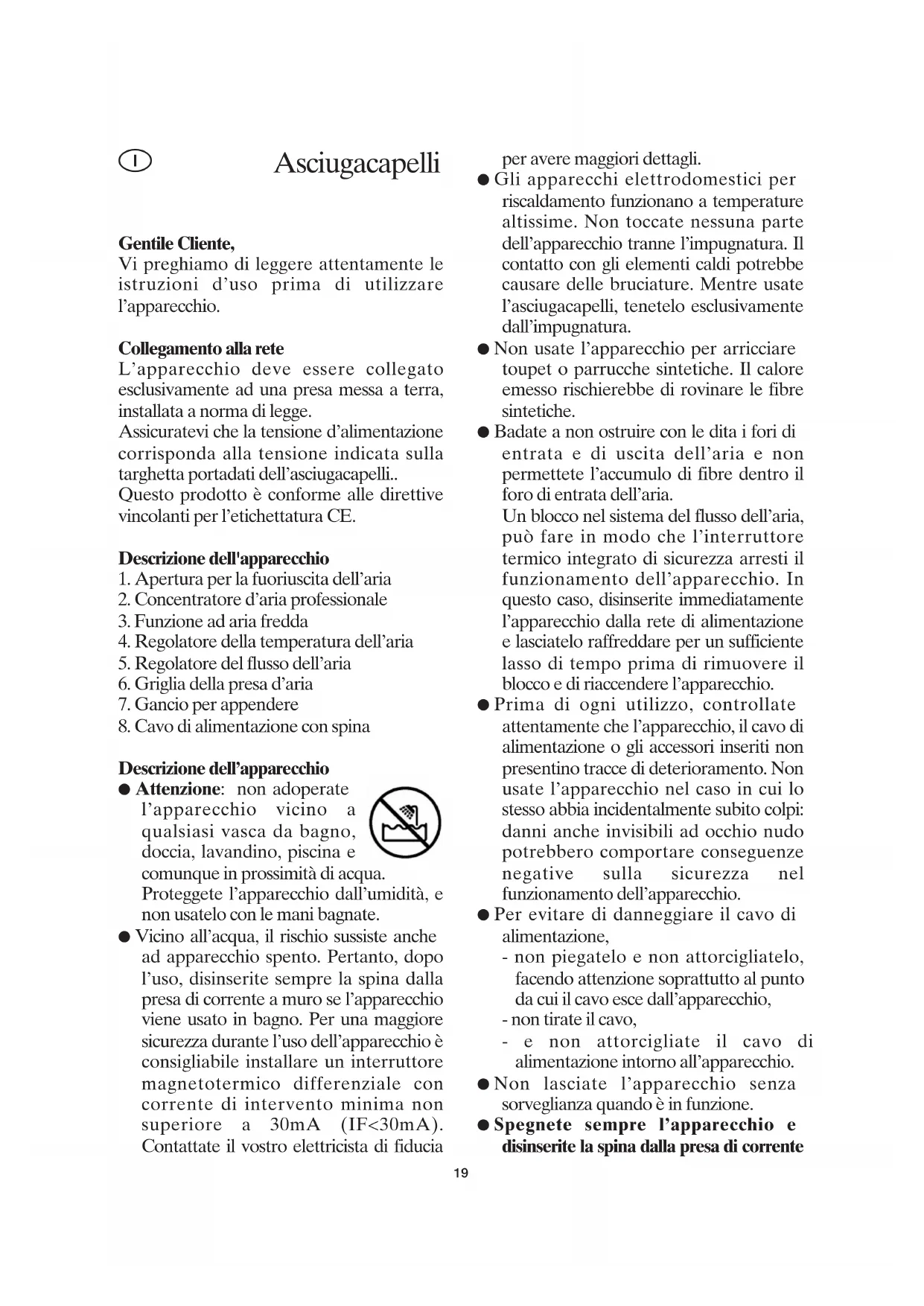 Descrizione dell’apparecchio ● Attenzione: non adoperate l’apparecchio vicino a qualsiasi vasca da bagno, doccia, lavandino, piscina e comunque in prossimità di acqua. Proteggete l’apparecchio dall’umidità, e non usatelo con le mani bagnate. ● Vicino all’acqua, il rischio sussiste anche ad apparecchio spento. Pertanto, dopo l’uso, disinserite sempre la spina dalla presa di corrente a muro se l’apparecchio viene usato in bagno. Per una maggiore sicurezza durante l’uso dell’apparecchio è consigliabile installare un interruttore magnetotermico differenziale con corrente di intervento minima non superiore a 30mA (IF<30mA). Contattate il vostro elettricista di fiducia per avere maggiori dettagli. ● Gli apparecchi elettrodomestici per riscaldamento funzionano a temperature altissime. Non toccate nessuna parte dell’apparecchio tranne l’impugnatura. Il contatto con gli elementi caldi potrebbe causare delle bruciature. Mentre usate l’asciugacapelli, tenetelo esclusivamente dall’impugnatura. ● Non usate l’apparecchio per arricciare toupet o parrucche sintetiche. Il calore emesso rischierebbe di rovinare le fibre sintetiche. ● Badate a non ostruire con le dita i fori di entrata e di uscita dell’aria e non permettete l’accumulo di fibre dentro il foro di entrata dell’aria. Un blocco nel sistema del flusso dell’aria, può fare in modo che l’interruttore termico integrato di sicurezza arresti il funzionamento dell’apparecchio. In questo caso, disinserite immediatamente l’apparecchio dalla rete di alimentazione e lasciatelo raffreddare per un sufficiente lasso di tempo prima di rimuovere il blocco e di riaccendere l’apparecchio. ● Prima di ogni utilizzo, controllate attentamente che l’apparecchio, il cavo di alimentazione o gli accessori inseriti non presentino tracce di deterioramento. Non usate l’apparecchio nel caso in cui lo stesso abbia incidentalmente subito colpi: danni anche invisibili ad occhio nudo potrebbero comportare conseguenze negative sulla sicurezza nel funzionamento dell’apparecchio. ● Per evitare di danneggiare il cavo di alimentazione, - non piegatelo e non attorcigliatelo, facendo attenzione soprattutto al punto da cui il cavo esce dall’apparecchio, - non tirate il cavo, - e non attorcigliate il cavo di alimentazione intorno all’apparecchio. ● Non lasciate l’apparecchio senza sorveglianza quando è in funzione. ● Spegnete sempre l’apparecchio e disinserite la spina dalla presa di corrente Asciugacapelli dopo l’uso nonché - in caso di cattivo funzionamento, - mentre effettuate la pulizia dell’apparecchio. ● Per disinserire la spina dalla presa di corrente, non tirate mai il cavo di alimentazione ma afferrate direttamente la spina. ● Posate l’apparecchio solo su superfici resistenti al calore durante l’uso o immediatamente dopo l’uso. ● Questo apparecchio non è previsto per l’utilizzo da parte di persone (bambini compresi) con ridotte capacità fisiche, sensoriali o mentali, o con scarsa esperienza o conoscenza, a meno che non siano adeguatamente sorvegliate o istruite sull’uso dell’apparecchio dalla persona responsabile della loro sicurezza. ● È necessario sorvegliare che i bambini non giochino con l’apparecchio. ● Nessuna responsabilità verrà assunta in caso di danni risultanti da un uso errato o dalla non conformità alle istruzioni. ● Questo apparecchio è destinato ad uso esclusivamente domestico e non è inteso per uso professionale. ● In conformità alle norme di sicurezza e per evitare ogni pericolo, tutte le riparazioni di un apparecchio elettrico - compresa la sostituzione del cavo di alimentazione – devono essere effettuate da personale specializzato. Nel caso in cui l’apparecchio richieda una riparazione, rinviatelo ad uno dei nostri Centri Assistenza Clienti i cui indirizzi si trovano in appendice al presente manuale. Asciugacapelli con funzione a IONI La funzione a IONI contribuisce ad ottenere un’acconciatura morbida e in modo facile, eliminando la carica statica dei capelli. Sfrutta la formazione di una “nube ionica” negativa che elimina dai capelli la carica positiva impedendo così che i capelli “si elettrizzino”. La funzione a IONI si attiva automaticamente durante il funzionamento, indipendentemente dalle impostazioni dell’interruttore. Concentratore d’aria Il concentratore d’aria può essere inserito sull’apertura di fuoriuscita dell’aria per facilitare la messa in piega dei capelli durante l’asciugatura. Regolatori del flusso e della temperatura dell’aria Utilizzando diverse combinazioni dei regolatori del flusso d’aria e della temperatura, è possibile ottenere varie impostazioni per asciugare i capelli. Il regolatore del flusso d’aria varia l’intensità di fuoriuscita dell’aria, mentre il regolatore di temperatura ne stabilisce il calore. Con il regolatore del flusso d’aria impostato sulla posizione “0”, l’asciugacapelli è spento. Funzione ad aria fredda La funzione ad aria fredda può essere utilizzata in qualunque momento del processo di asciugatura. Questa funzione serve per ottenere una messa in piega duratura. Funzionamento Inserite l’asciugacapelli in una presa di corrente a muro adatta e selezionate l’impostazione di potenza desiderata agendo sugli interruttori posti sull’impugnatura. Manutenzione e pulizia ● Prima di procedere alla pulizia dell’asciugacapelli, disinseritelo dalla presa di corrente e lasciatelo raffreddare completamente. ● Per evitare ogni rischio di scossa elettrica, non pulite l’asciugacapelli con acqua e non immergetelo in acqua.